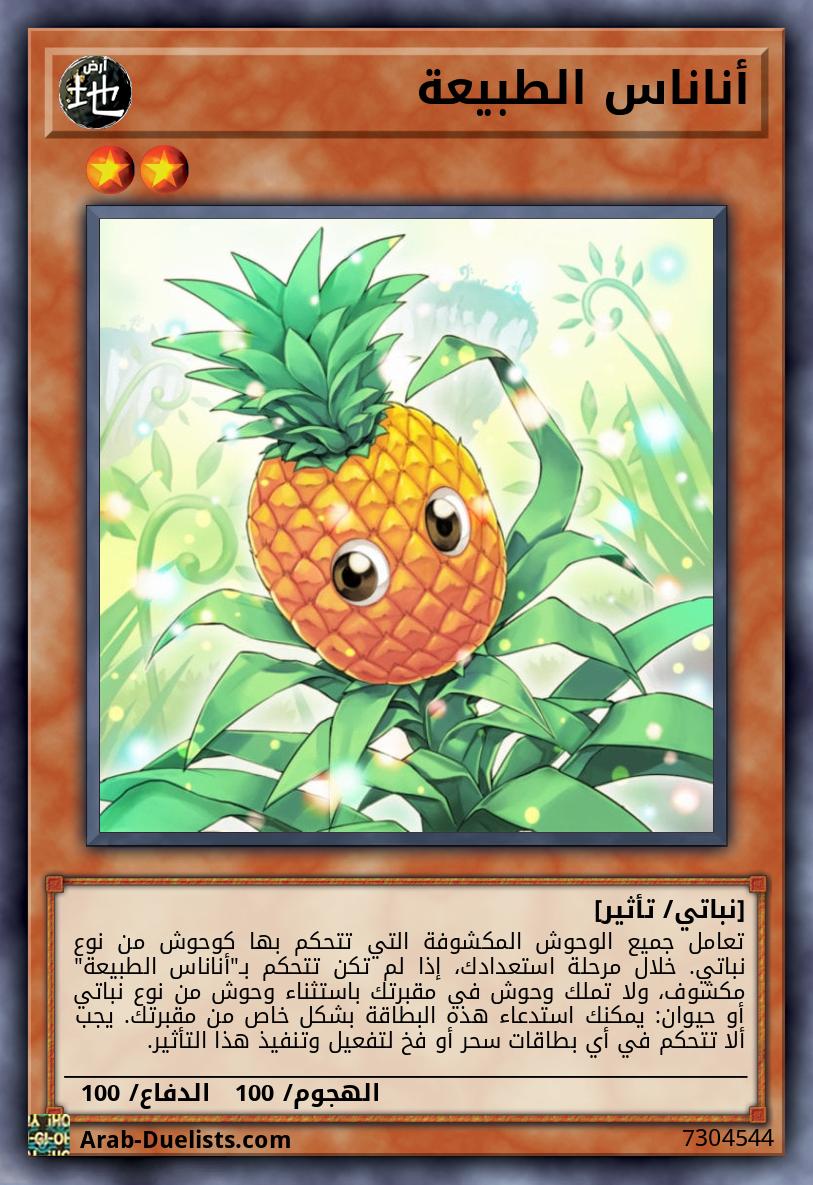 تعامل جميع الوحوش المكشوفة التي تتحكم بها كوحوش من نوع نباتي. خلال مرحلة استعدادك، إذا لم تكن تتحكم بـ"أناناس الطبيعة" مكشوف، ولا تملك وحوش في مقبرتك باستثناء وحوش من نوع نباتي أو حيوان: يمكنك استدعاء هذه البطاقة بشكل خاص من مقبرتك. يجب ألا تتحكم في أي بطاقات سحر أو فخ لتفعيل وتنفيذ هذا التأثير.