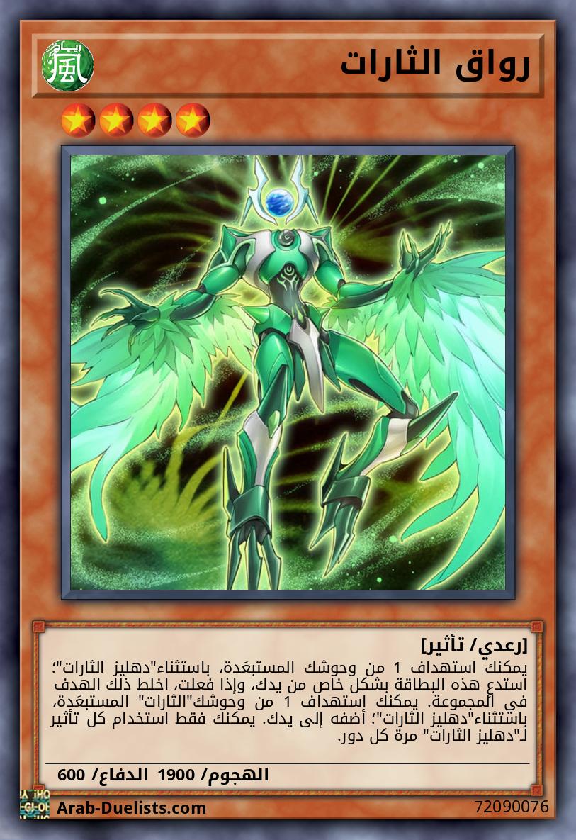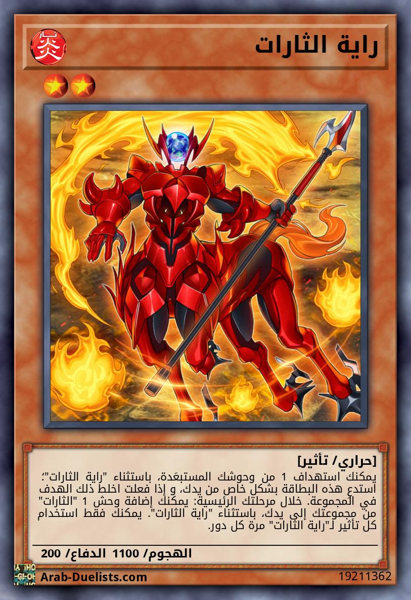 يمكنك استهداف 1 من وحوشك المستبعَدة، باستثناء "راية الثارات"؛ استدعِ هذه البطاقة بشكل خاص من يدك، و إذا فعلت اخلط ذلك الهدف في المجموعة. خلال مرحلتك الرئيسية: يمكنك إضافة وحش 1 "الثارات" من مجموعتك إلى يدك، باستثناء "راية الثارات". يمكنك فقط استخدام كل تأثير لـ"راية الثارات" مرة كل دور.