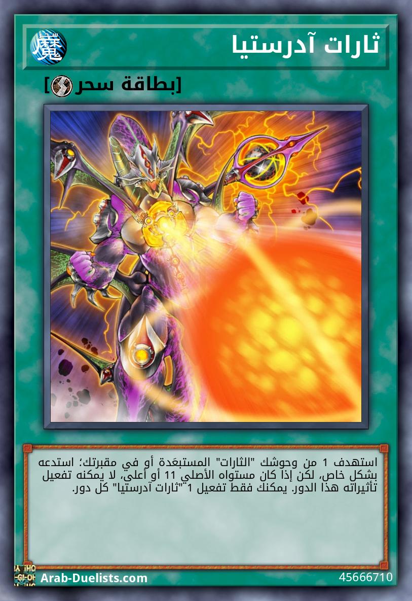 استهدف 1 من وحوشك "الثارات" المستبعَدة أو في مقبرتك؛ استدعه بشكل خاص، لكن إذا كان مستواه الأصلي 11 أو أعلى، لا يمكنه تفعيل تأثيراته هذا الدور. يمكنك فقط تفعيل 1 "ثارات آدرستيا" كل دور.