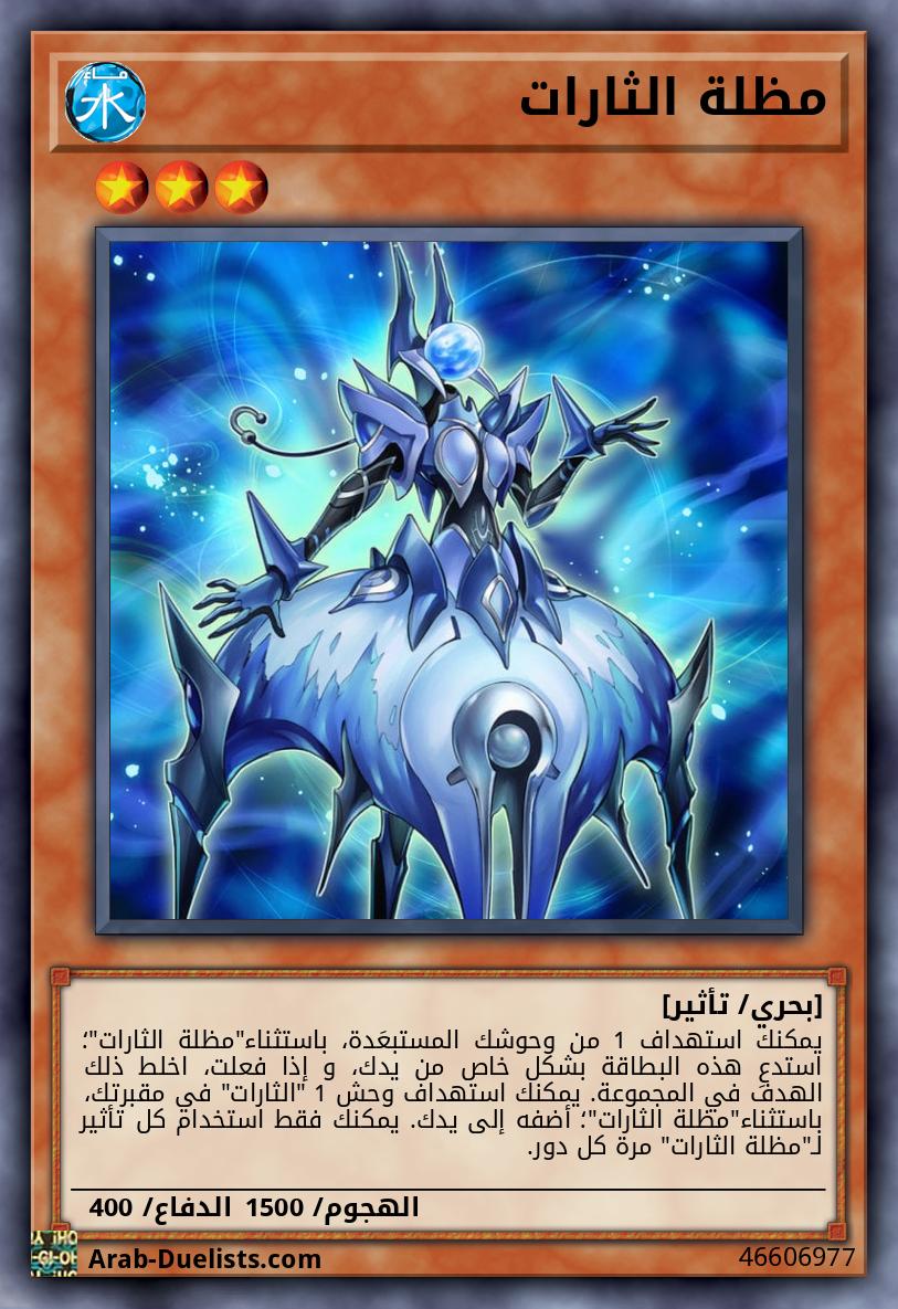 يمكنك استهداف 1 من وحوشك المستبعَدة، باستثناء"مظلة الثارات"؛ استدعِ هذه البطاقة بشكل خاص من يدك، و إذا فعلت، اخلط ذلك الهدف في المجموعة. يمكنك استهداف وحش 1 "الثارات" في مقبرتك، باستثناء"مظلة الثارات"؛ أضفه إلى يدك. يمكنك فقط استخدام كل تأثير لـ"مظلة الثارات" مرة كل دور.