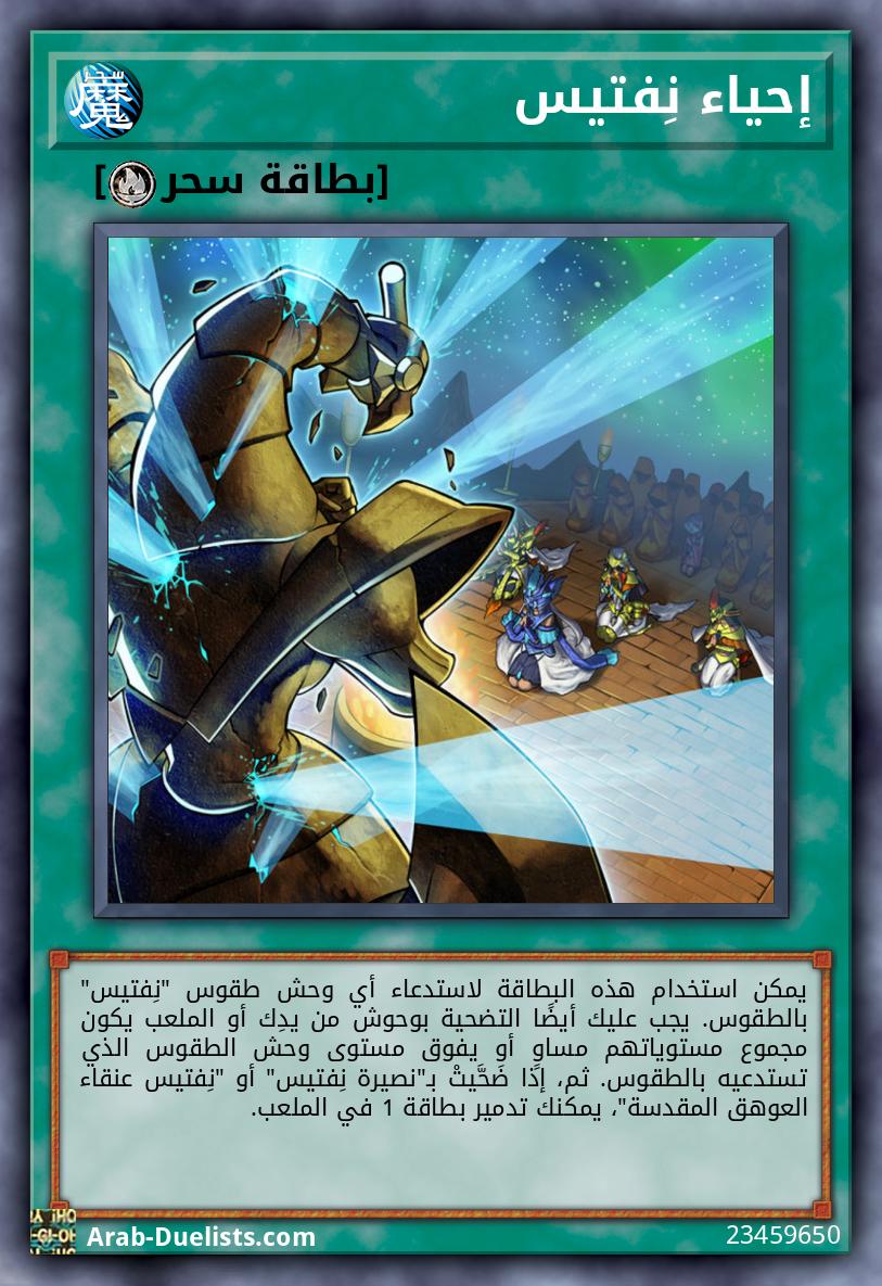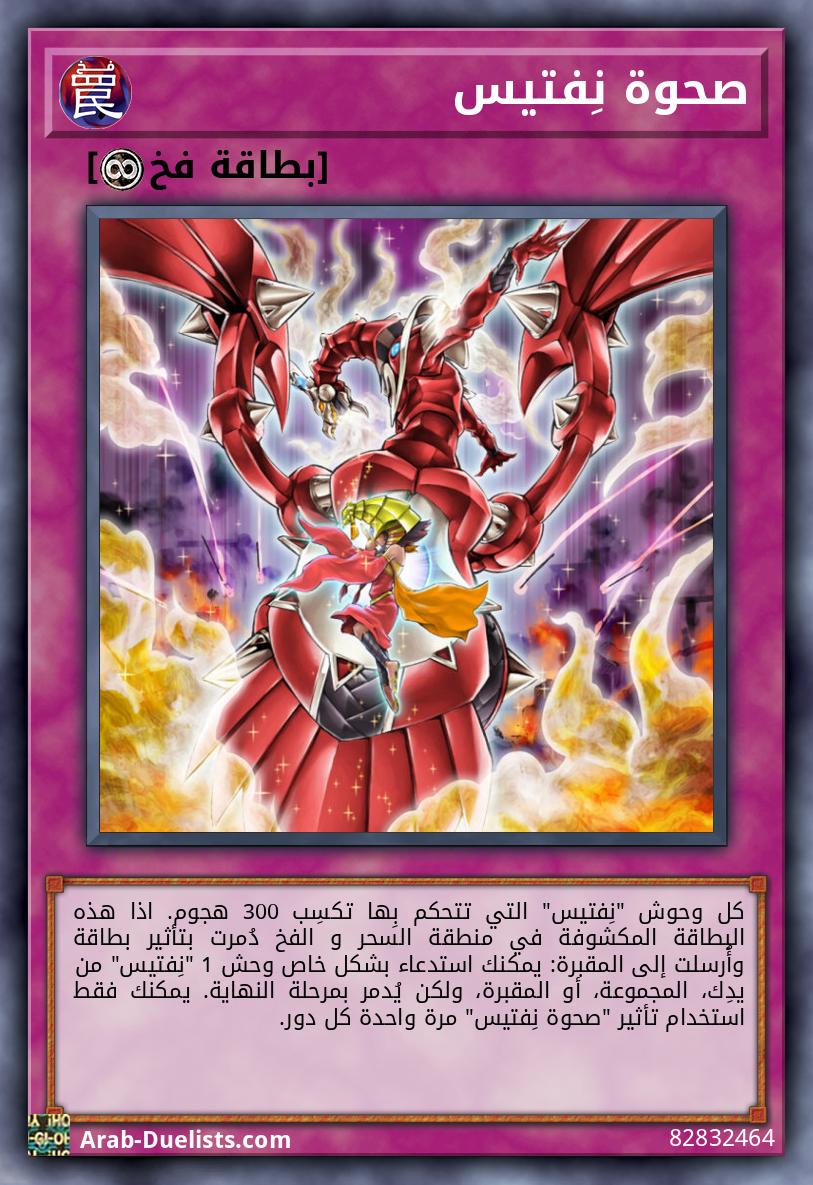 يُمكنك التضحية بهذه البطاقة مع وحش 1 آخر؛ استدعِ 1 "نِفتيس عنقاء السماء" بشكل خاص من يدِك أو مجموعتك.