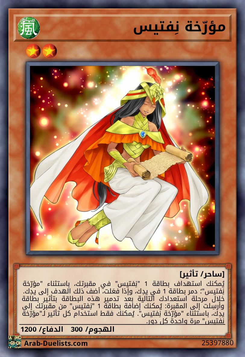 يُمكنك استهداف بطاقة 1 "نِفتيس" في مقبرتك، باستثناء "مؤرّخة نِفتيس"؛ دمر بطاقة 1 في يدِك، وإذا فعَلت، أضف ذلك الهدف إلى يدِك. خلال مرحلة استعدادك التالية بعد تدمير هذه البطاقة بتأثير بطاقة وأرسِلت إلى المقبرة: يُمكنك إضافة بطاقة 1 "نِفتيس" من مقبرتك إلى يدِك، باستثناء "مؤرّخة نِفتيس". يُمكنك فقط استخدام كل تأثير لـ"مؤرّخة نِفتيس" مرة واحدة كل دور.