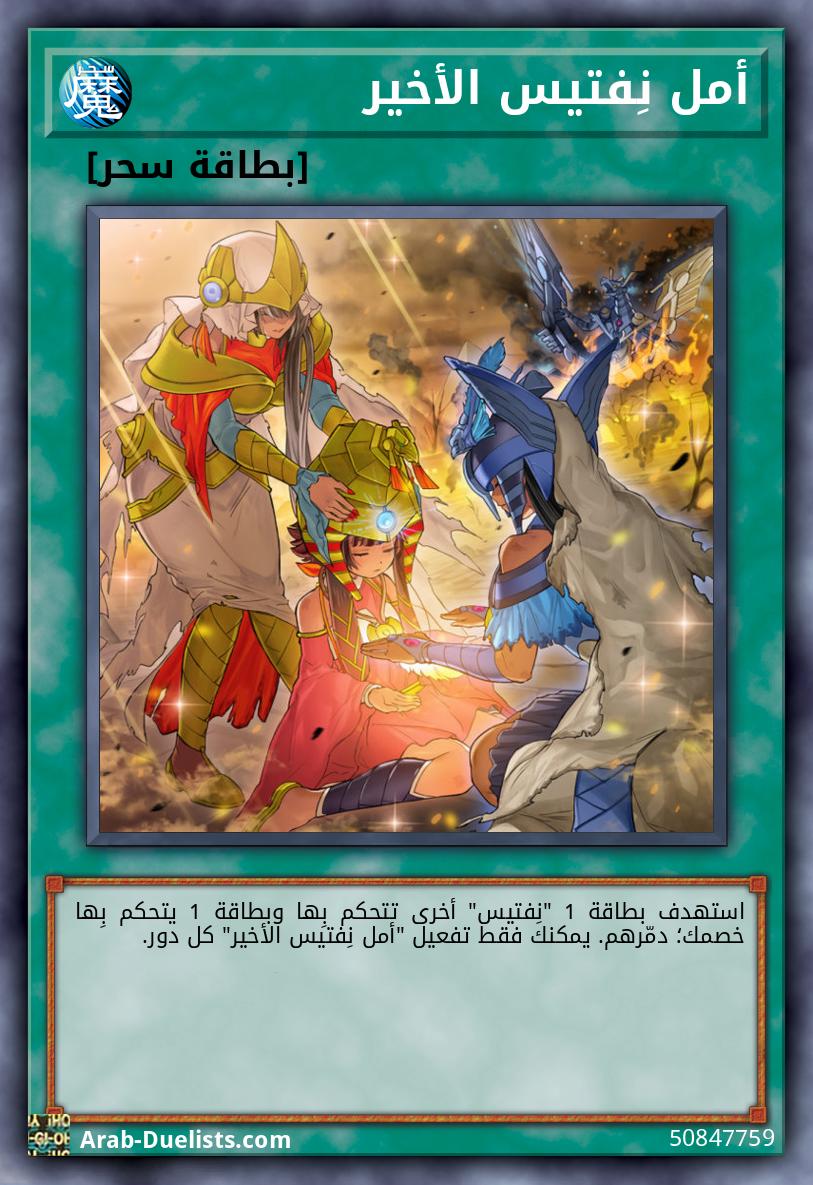 استهدف بطاقة 1 "نِفتيس" أخرى تتحكم بِها وبطاقة 1 يتحكم بِها خصمك؛ دمّرهم. يمكنك فقط تفعيل "أمل نِفتيس الأخير" كل دور.