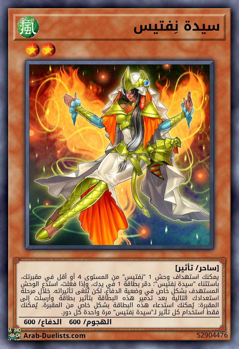 يمكنك استهداف وحش 1 "نِفتيس" من المستوى 4 أو أقل في مقبرتك، باستثناء "سيدة نِفتيس"؛ دمّر بطاقة 1 في يدِك، وإذا فعَلت، استدعِ الوحش المستهدف بشكل خاص في وضعية الدفاع، لكن تُلغى تأثيراته. خلال مرحلة استعدادك التالية بعد تدمير هذه البطاقة بتأثير بطاقة وأرسِلت إلى المقبرة: يُمكنك استدعاء هذه البطاقة بشكل خاص من المقبرة. يُمكنك فقط استخدام كل تأثير لـ"سيدة نِفتيس" مرة واحدة كل دور.