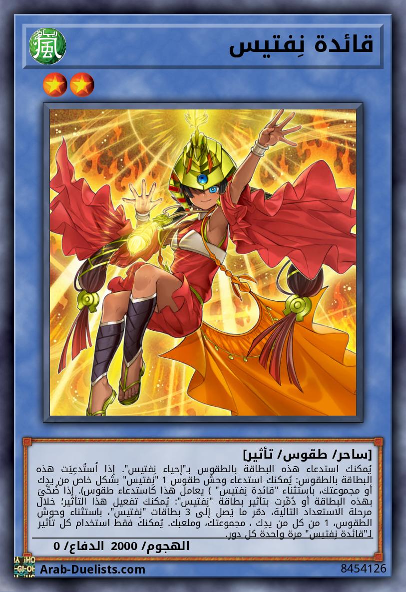 يُمكنك استدعاء هذه البطاقة بالطقوس بـ"إحياء نِفتيس". إذا اُستُدعِيَت هذه البطاقة بالطقوس: يُمكنك استدعاء وحش طقوس 1 "نِفتيس" بشكل خاص من يدِك أو مجموعتك، باستثناء "قائدة نِفتيس" ( يعامل هذا كاستدعاء طقوس). إذا ضُحِّيَ بهذه البطاقة أو دُمِّرت بتأثير بطاقة "نِفتيس": يُمكنك تفعيل هذا التأثير؛ خلال مرحلة الاستعداد التالية، دمّر ما يَصل إلى 3 بطاقات "نِفتيس"، باستثناء وحوش الطقوس، 1 من كل من يدِك ، مجموعتك، وملعبك. يُمكنك فقط استخدام كل تأثير لـ"قائدة نِفتيس" مرة واحدة كل دور.