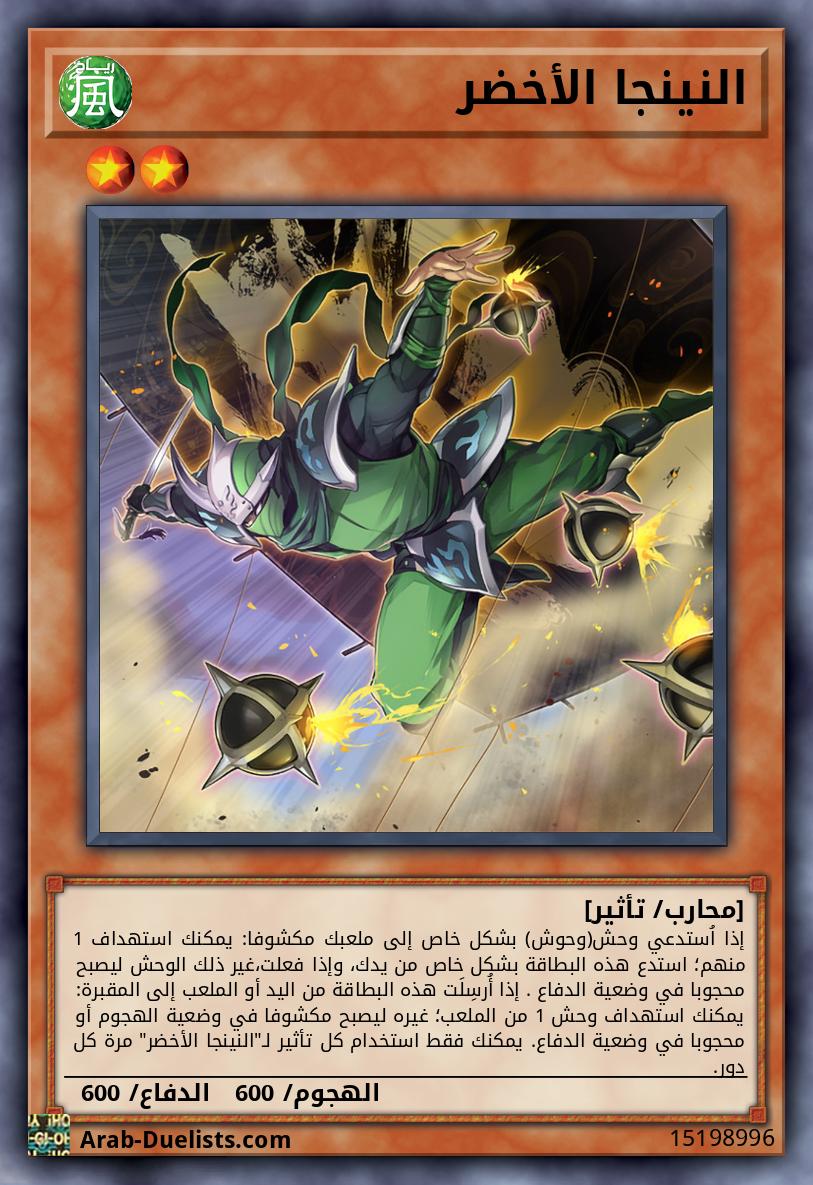إذا اُستدعي وحش(وحوش) بشكل خاص إلى ملعبك مكشوفا: يمكنك استهداف 1 منهم؛ استدع هذه البطاقة بشكل خاص من يدك، وإذا فعلت،غير ذلك الوحش ليصبح محجوبا في وضعية الدفاع . إذا أُرسِلَت هذه البطاقة من اليد أو الملعب إلى المقبرة: يمكنك استهداف وحش 1 من الملعب؛ غيره ليصبح مكشوفا في وضعية الهجوم أو محجوبا في وضعية الدفاع. يمكنك فقط استخدام كل تأثير لـ"النينجا الأخضر" مرة كل دور.
