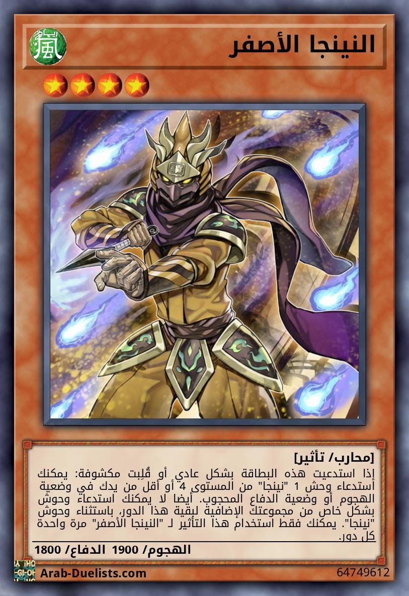 إذا استدعيت هذه البطاقة بشكل عادي أو قُلِبت مكشوفة: يمكنك استدعاء وحش 1 "نينجا" من المستوى 4 أو أقل من يدك في وضعية الهجوم أو وضعية الدفاع المحجوب. أيضا لا يمكنك استدعاء وحوش بشكل خاص من مجموعتك الإضافية لبقية هذا الدور، باستثناء وحوش "نينجا". يمكنك فقط استخدام هذا التأثير لـ "النينجا الأصفر" مرة واحدة كل دور.