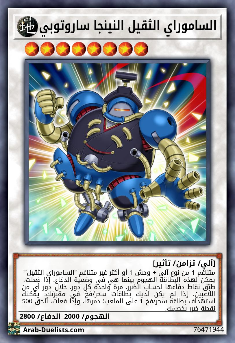 متناغم 1 من نوع آلي + وحش 1 أو أكثر غير متناغم "الساموراي الثقيل" يمكن لهذه البطاقة الهجوم بينما هي في وضعية الدفاع. إذا فعلت، طبّق نقاط دفاعها لحساب الضرر. مرة واحدة كل دور، خلال دور أي من اللاعبين، إذا لم يكن لديك بطاقات سحر/فخ في مقبرتك: يمكنك استهداف بطاقة سحر/فخ 1 على الملعب؛ دمرها، وإذا فعلت، ألحق 500 نقطة ضرر بخصمك.