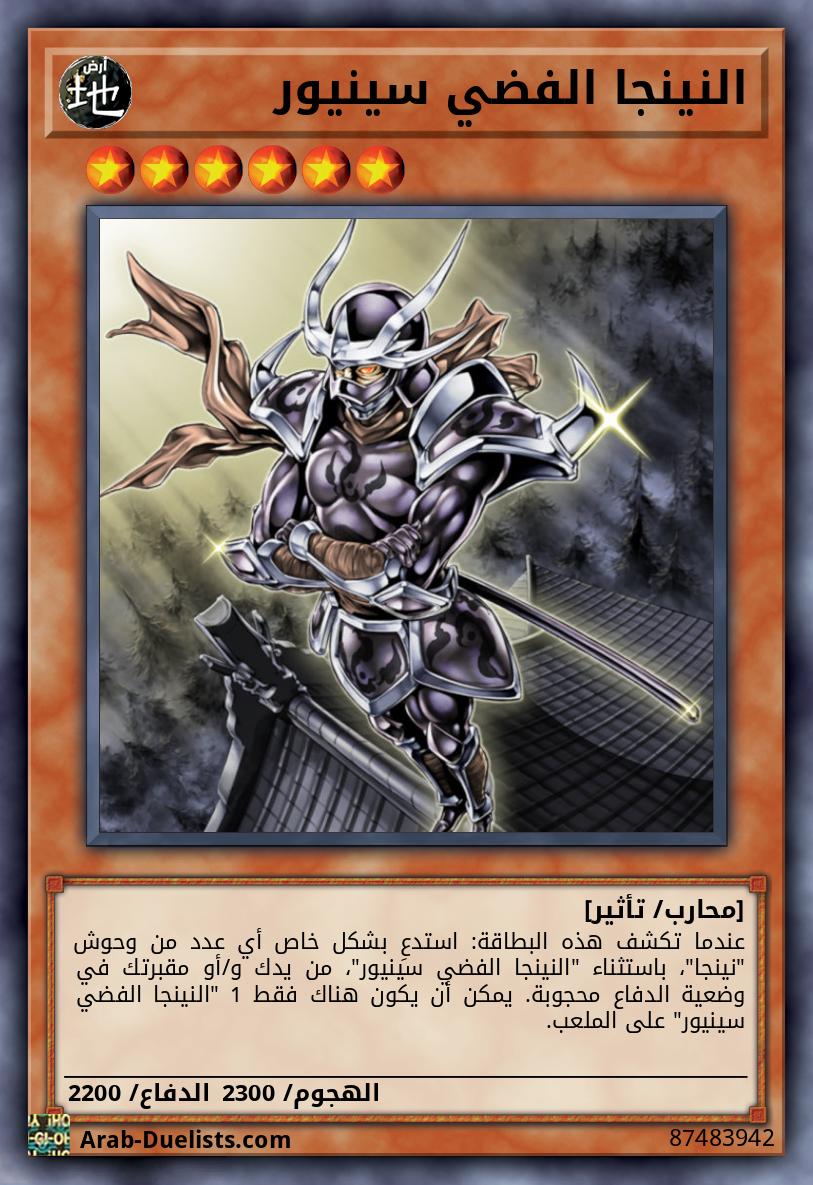 عندما تكشف هذه البطاقة: استدعِ بشكل خاص أي عدد من وحوش "نينجا"، باستثناء "النينجا الفضي سينيور"، من يدك و/أو مقبرتك في وضعية الدفاع محجوبة. يمكن أن يكون هناك فقط 1 "النينجا الفضي سينيور" على الملعب.