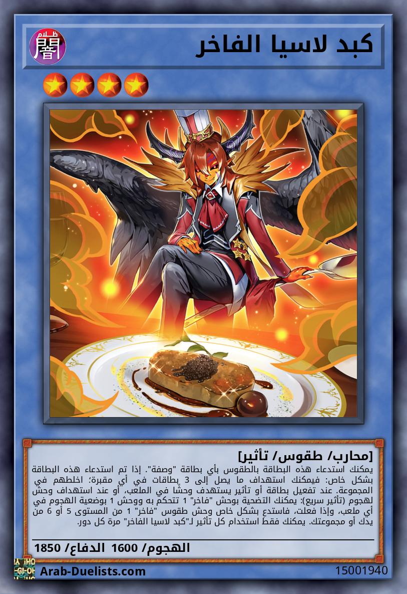 يمكنك استدعاء هذه البطاقة بالطقوس بأي بطاقة "وصفة". إذا تم استدعاء هذه البطاقة بشكل خاص: فيمكنك استهداف ما يصل إلى 3 بطاقات في أي مقبرة؛ اخلطهم في المجموعة. عند تفعيل بطاقة أو تأثير يستهدف وحشًا في الملعب، أو عند استهداف وحش لهجوم (تأثير سريع): يمكنك التضحية بوحش "فاخر" 1 تتحكم به ووحش 1 بوضعية الهجوم في أي ملعب، وإذا فعلت، فاستدعِ بشكل خاص وحش طقوس "فاخر" 1 من المستوى 5 أو 6 من يدك أو مجموعتك. يمكنك فقط استخدام كل تأثير لـ"كبد لاسيا الفاخر" مرة كل دور.
