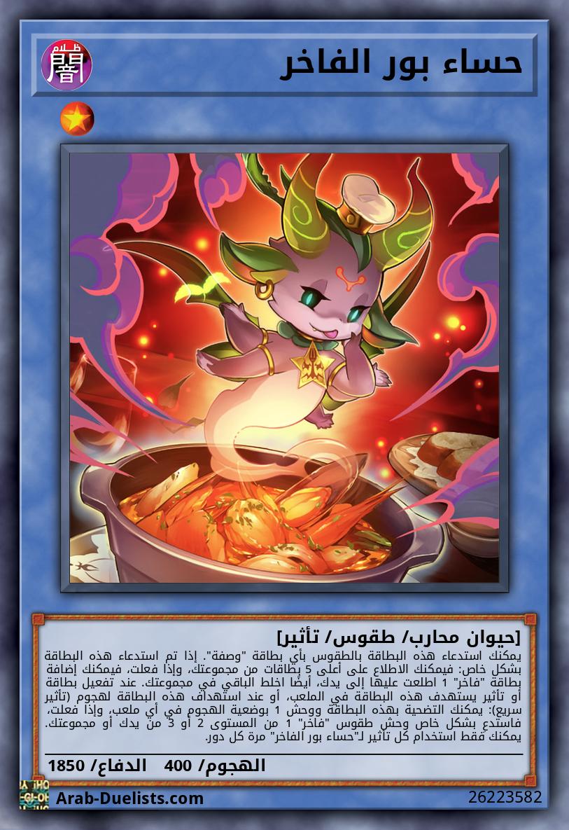 يمكنك استدعاء هذه البطاقة بالطقوس بأي بطاقة "وصفة". إذا تم استدعاء هذه البطاقة بشكل خاص: فيمكنك الاطلاع على أعلى 5 بطاقات من مجموعتك، وإذا فعلت، فيمكنك إضافة بطاقة "فاخر" 1 اطلعت عليها إلى يدك، أيضًا اخلط الباقي في مجموعتك. عند تفعيل بطاقة أو تأثير يستهدف هذه البطاقة في الملعب، أو عند استهداف هذه البطاقة لهجوم (تأثير سريع): يمكنك التضحية بهذه البطاقة ووحش 1 بوضعية الهجوم في أي ملعب، وإذا فعلت، فاستدعِ بشكل خاص وحش طقوس "فاخر" 1 من المستوى 2 أو 3 من يدك أو مجموعتك. يمكنك فقط استخدام كل تأثير لـ"حساء بور الفاخر" مرة كل دور.