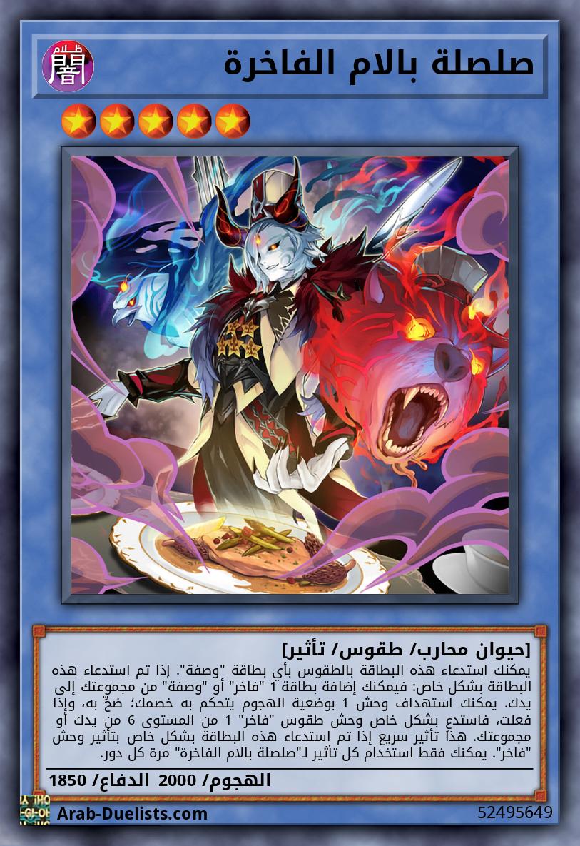 يمكنك استدعاء هذه البطاقة بالطقوس بأي بطاقة "وصفة". إذا تم استدعاء هذه البطاقة بشكل خاص: فيمكنك إضافة بطاقة 1 "فاخر" أو "وصفة" من مجموعتك إلى يدك. يمكنك استهداف وحش 1 بوضعية الهجوم يتحكم به خصمك؛ ضحِّ به، وإذا فعلت، فاستدعِ بشكل خاص وحش طقوس "فاخر" 1 من المستوى 6 من يدك أو مجموعتك. هذا تأثير سريع إذا تم استدعاء هذه البطاقة بشكل خاص بتأثير وحش "فاخر". يمكنك فقط استخدام كل تأثير لـ"صلصلة بالام الفاخرة" مرة كل دور.