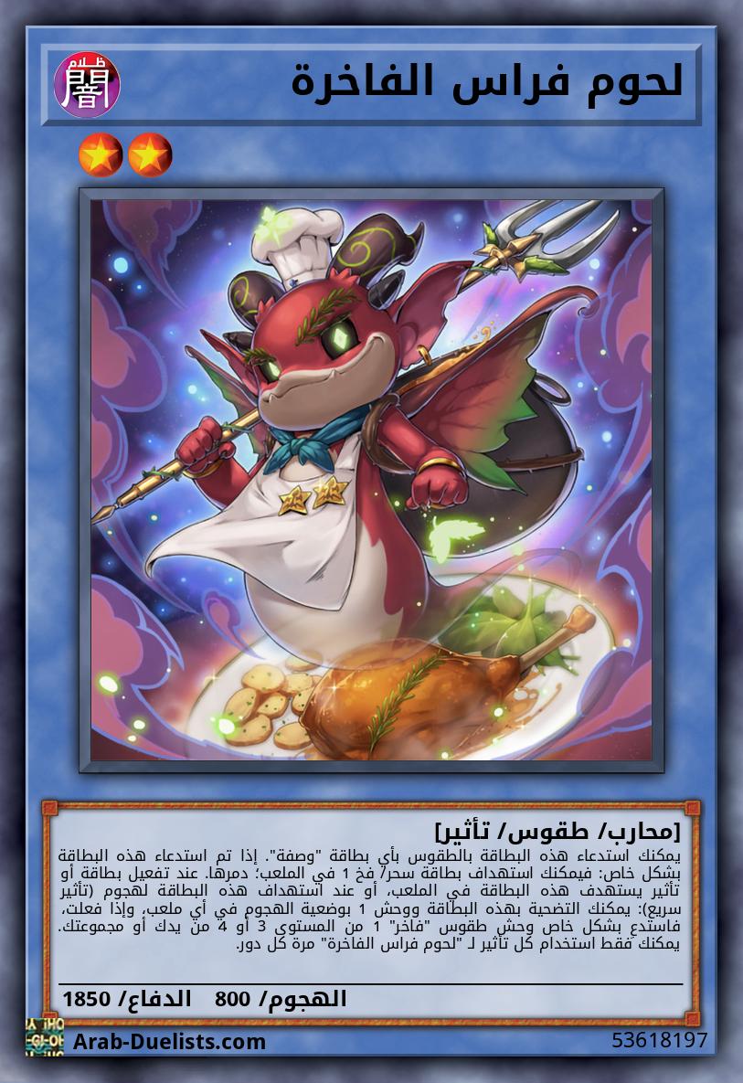 يمكنك استدعاء هذه البطاقة بالطقوس بأي بطاقة "وصفة". إذا تم استدعاء هذه البطاقة بشكل خاص: فيمكنك استهداف بطاقة سحر/ فخ 1 في الملعب؛ دمرها. عند تفعيل بطاقة أو تأثير يستهدف هذه البطاقة في الملعب، أو عند استهداف هذه البطاقة لهجوم (تأثير سريع): يمكنك التضحية بهذه البطاقة ووحش 1 بوضعية الهجوم في أي ملعب، وإذا فعلت، فاستدعِ بشكل خاص وحش طقوس "فاخر" 1 من المستوى 3 أو 4 من يدك أو مجموعتك. يمكنك فقط استخدام كل تأثير لـ "لحوم فراس الفاخرة" مرة كل دور.