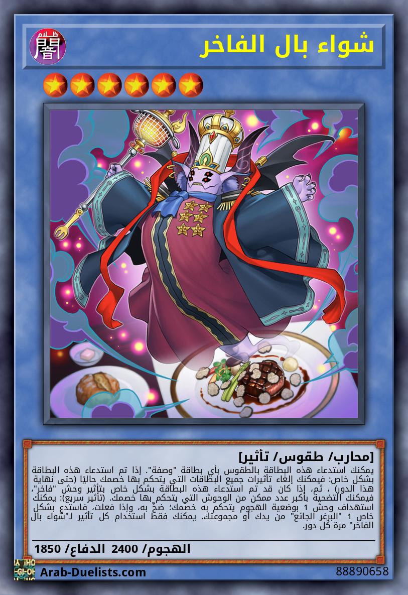 يمكنك استدعاء هذه البطاقة بالطقوس بأي بطاقة "وصفة". إذا تم استدعاء هذه البطاقة بشكل خاص: فيمكنك إلغاء تأثيرات جميع البطاقات التي يتحكم بها خصمك حاليًا (حتى نهاية هذا الدور) ، ثم، إذا كان قد تم استدعاء هذه البطاقة بشكل خاص بتأثير وحش "فاخر"، فيمكنك التضحية بأكبر عدد ممكن من الوحوش التي يتحكم بها خصمك. (تأثير سريع): يمكنك استهداف وحش 1 بوضعية الهجوم يتحكم به خصمك؛ ضحِّ به، وإذا فعلت، فاستدعِ بشكل خاص 1 "البرغر الجائع" من يدك أو مجموعتك. يمكنك فقط استخدام كل تأثير لـ"شواء بال الفاخر" مرة كل دور.