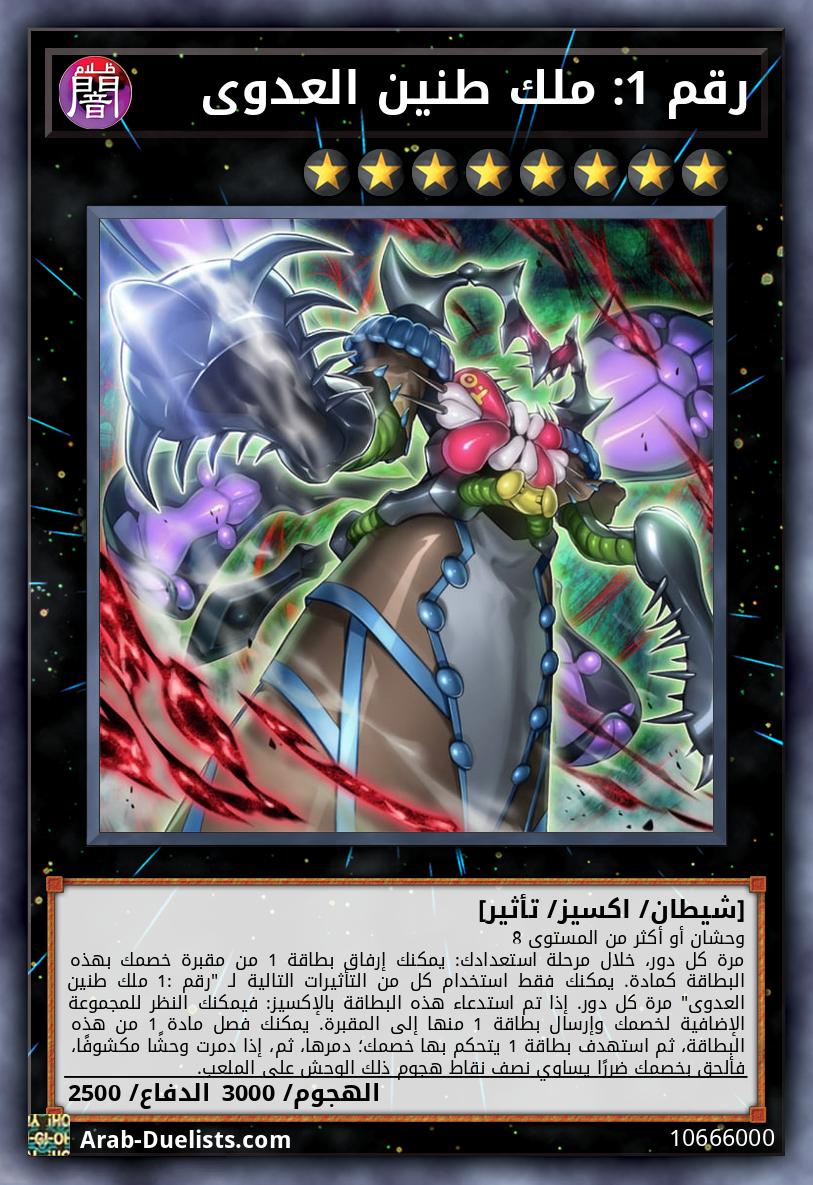 وحشان أو أكثر من المستوى 8 مرة كل دور، خلال مرحلة استعدادك: يمكنك إرفاق بطاقة 1 من مقبرة خصمك بهذه البطاقة كمادة. يمكنك فقط استخدام كل من التأثيرات التالية لـ "رقم 1: ملك طنين العدوى" مرة كل دور. إذا تم استدعاء هذه البطاقة بالإكسيز: فيمكنك النظر للمجموعة الإضافية لخصمك وإرسال بطاقة 1 منها إلى المقبرة. يمكنك فصل مادة 1 من هذه البطاقة، ثم استهدف بطاقة 1 يتحكم بها خصمك؛ دمرها، ثم، إذا دمرت وحشًا مكشوفًا، فألحق بخصمك ضررًا يساوي نصف نقاط هجوم ذلك الوحش على الملعب.