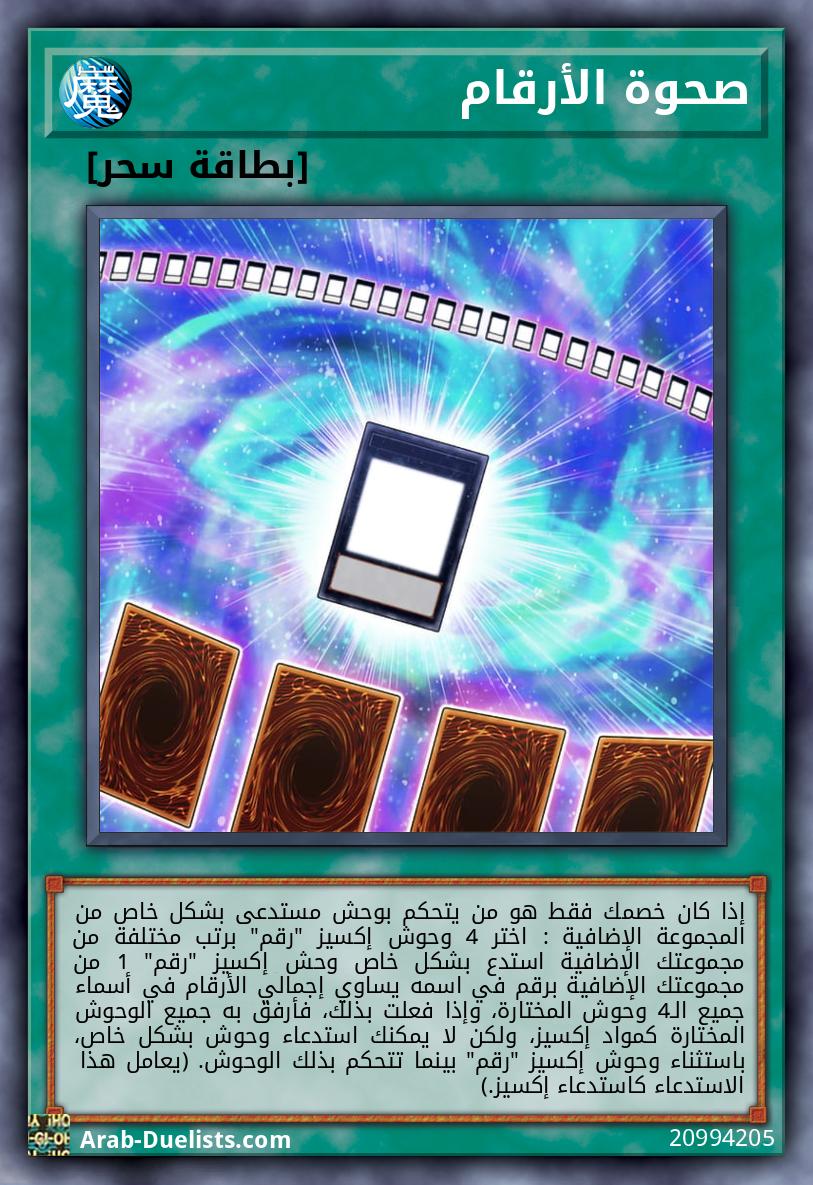 إذا كان خصمك فقط هو من يتحكم بوحش مستدعى بشكل خاص من المجموعة الإضافية : اختر 4 وحوش إكسيز "رقم" برتب مختلفة من مجموعتك الإضافية استدع بشكل خاص وحش إكسيز "رقم" 1 من مجموعتك الإضافية برقم في اسمه يساوي إجمالي الأرقام في أسماء جميع الـ4 وحوش المختارة، وإذا فعلت بذلك، فأرفق به جميع الوحوش المختارة كمواد إكسيز، ولكن لا يمكنك استدعاء وحوش بشكل خاص، باستثناء وحوش إكسيز "رقم" بينما تتحكم بذلك الوحوش. (يعامل هذا الاستدعاء كاستدعاء إكسيز.)