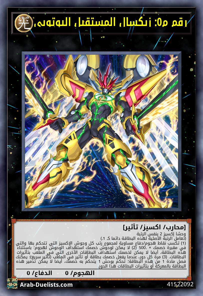 وحشا إكسيز 2 بنفس الرتبة (تعامل الرتبة الأصلية لهذه البطاقة دائما كـ 1.) (1) تكسب نقاط هجوم/دفاع مساوية لمجموع رتب كل وحوش الإكسيز التي تتحكم بها والتي في مقبرة خصمك × 500. (2) لا يمكن لوحوش خصمك استهداف الوحوش لهجوم؛ باستثناء هذه البطاقة، أيضا لا يمكن لخصمك استهداف البطاقات الأخرى التي في الملعب بتأثيرات البطاقات. (3) مرة كل دور، عندما يفعل خصمك بطاقة أو تأثير في الملعب (تأثير سريع): يمكنك فصل مادة 1 من هذه البطاقة؛ تحكم بوحش 1 يتحكم به خصمك، أيضا لا يمكن تدمير هذه البطاقة بالمعركة أو بتأثيرات البطاقات هذا الدور.
