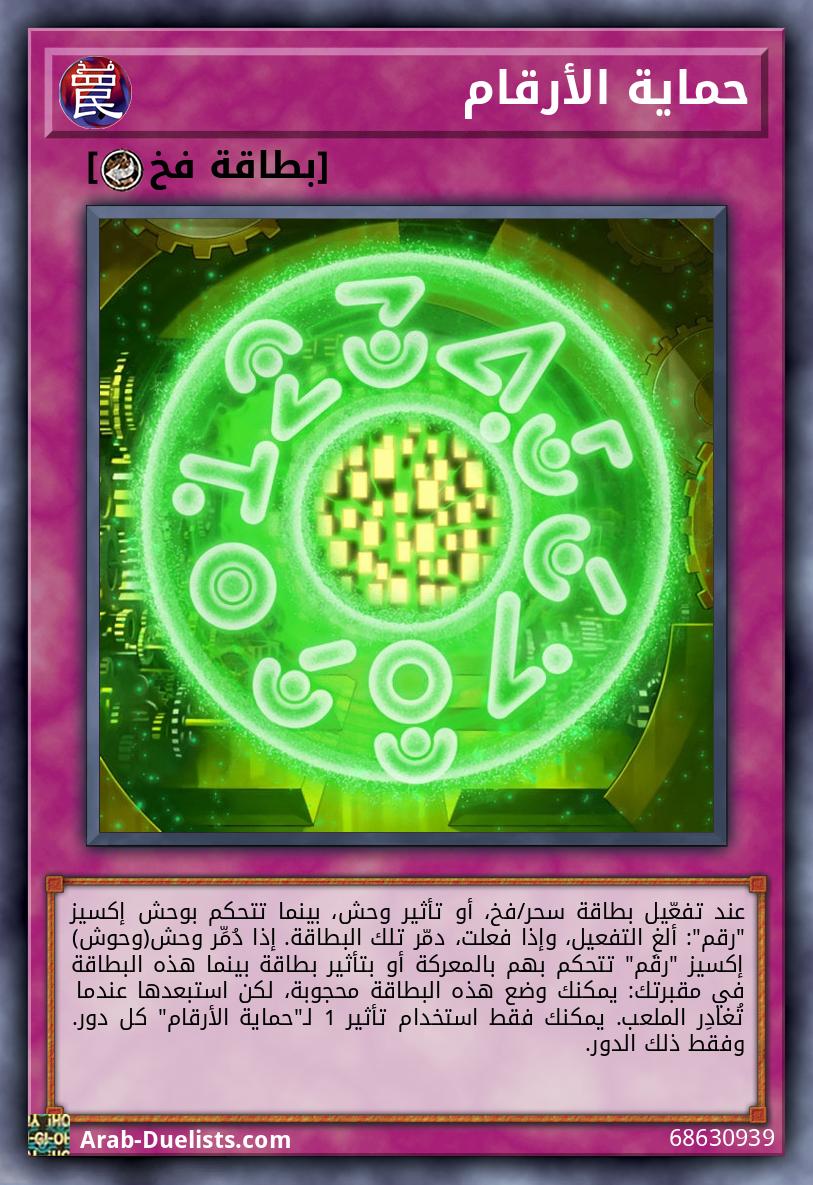 عند تفعّيل بطاقة سحر/فخ، أو تأثير وحش، بينما تتحكم بوحش إكسيز "رقم": ألغِ التفعيل، وإذا فعلت، دمّر تلك البطاقة. إذا دُمِّر وحش(وحوش) إكسيز "رقم" تتحكم بهم بالمعركة أو بتأثير بطاقة بينما هذه البطاقة في مقبرتك: يمكنك وضع هذه البطاقة محجوبة، لكن استبعدها عندما تُغادِر الملعب. يمكنك فقط استخدام تأثير 1 لـ"حماية الأرقام" كل دور. وفقط ذلك الدور.