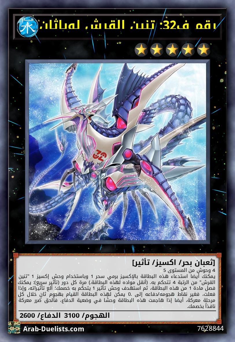 4 وحوش من المستوى 5 يمكنك أيضا استدعاء هذه البطاقة بالإكسيز برمي سحر 1 وباستخدام وحش إكسيز 1 "تنين القرش" من الرتبة 4 تتحكم به. (أنقل مواده لهذه البطاقة.) مرة كل دور (تأثير سريع): يمكنك فصل مادة 1 من هذه البطاقة، ثم استهدف وحش تأثير 1 يتحكم به خصمك؛ ألع تأثيراته، وإذا فعلت، فغير نقاط هجومه/دفاعه إلى 0. يمكن لهذه البطاقة القيام بهجوم ثانٍ خلال كل مرحلة معركة، أيضا إذا هاجمت هذه البطاقة وحشًا في وضعية الدفاع، فألحق ضرر معركة نافذاً بخصمك.