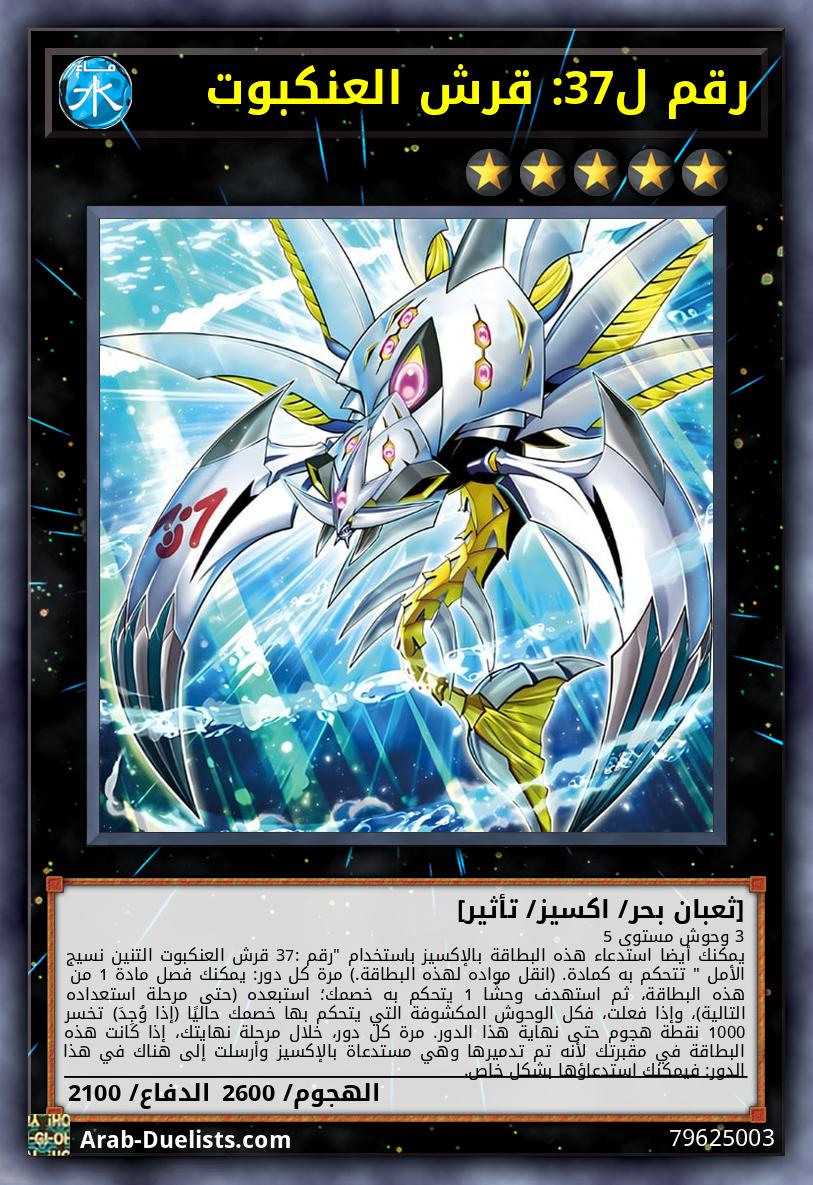 3 وحوش مستوى 5 يمكنك أيضا استدعاء هذه البطاقة بالإكسيز باستخدام "رقم 37: قرش العنكبوت التنين نسيج الأمل " تتحكم به كمادة. (انقل مواده لهذه البطاقة.) مرة كل دور: يمكنك فصل مادة 1 من هذه البطاقة، ثم استهدف وحشًا 1 يتحكم به خصمك؛ استبعده (حتى مرحلة استعداده التالية)، وإذا فعلت، فكل الوحوش المكشوفة التي يتحكم بها خصمك حاليًا (إذا وُجِدَ) تخسر 1000 نقطة هجوم حتى نهاية هذا الدور. مرة كل دور، خلال مرحلة نهايتك، إذا كانت هذه البطاقة في مقبرتك لأنه تم تدميرها وهي مستدعاة بالإكسيز وأرسلت إلى هناك في هذا الدور: فيمكنك استدعاؤها بشكل خاص.