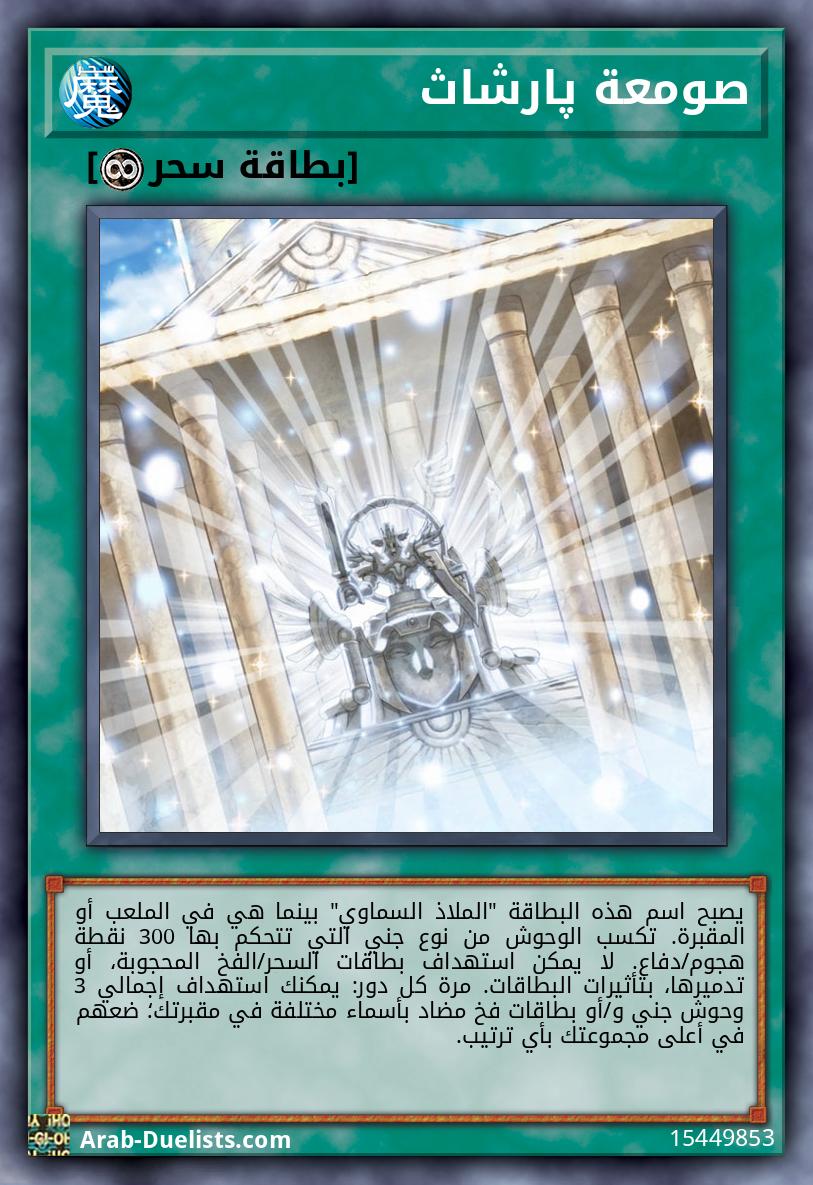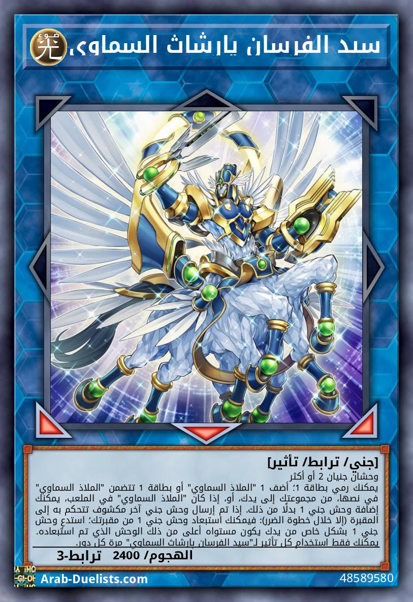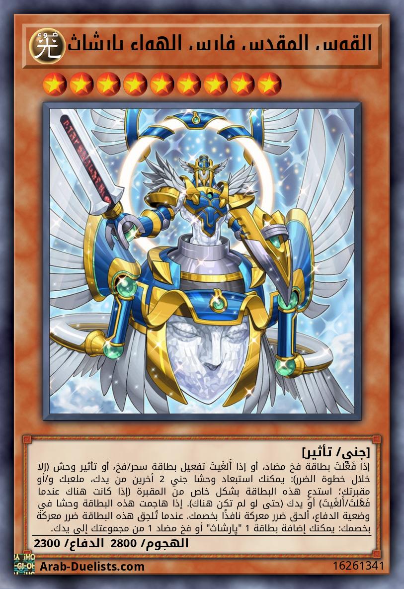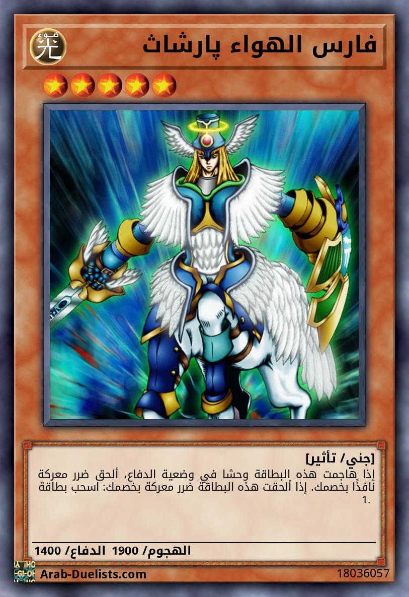 يمكنك استدعاء هذه البطاقة بشكل خاص (من يدك) بالتضحية بوحش 1 "فارس الهواء پارشاث". إذا هاجمت هذه البطاقة وحشًا في وضعية الدفاع، فألحق ضرر معركة نافذًا بخصمك. إذا ألحقت هذه البطاقة ضرر معركة بخصمك: اسحب بطاقة 1. بينما "الملاذ السماوي" في الملعب ونقاط حياتك أعلى من نقاط حياة خصمك، تكسب هذه البطاقة نقاط هجوم/دفاع مساوية لفارق نقاط الحياة.