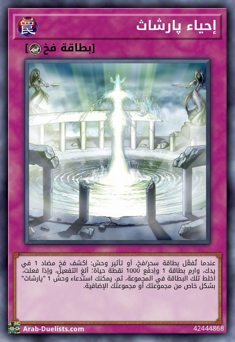 عندما تُفعَّل بطاقة سحر/فخ، أو تأثير وحش: اكشف فخ مضاد 1 في يدك، وارمِ بطاقة 1 واِدفَع 1000 نقطة حياة؛ ألغِ التفعيل، وإذا فعلت، اخلط تلك البطاقة في المجموعة، ثم، يمكنك استدعاء وحش 1 "پارشاث" بشكل خاص من مجموعتك أو مجموعتك الإضافية.