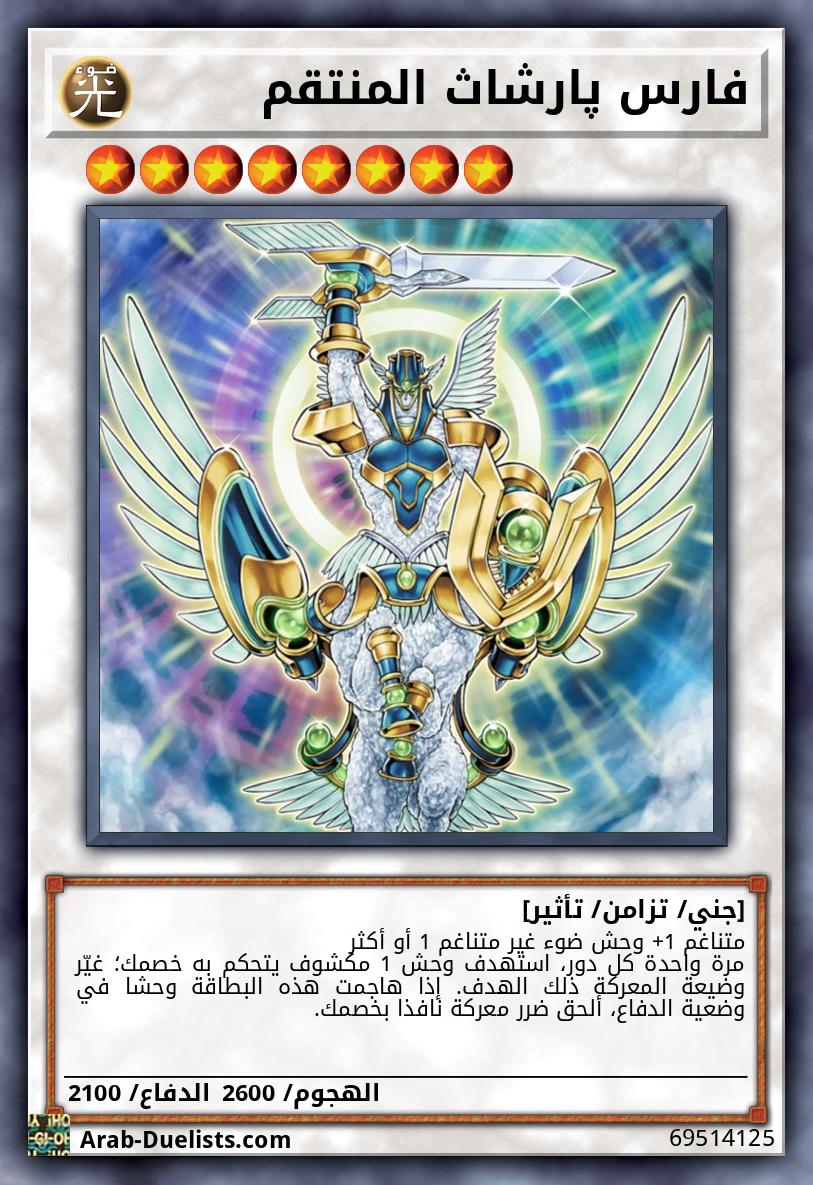 وحشان جنيان 2 أو أكثر يمكنك رمي بطاقة 1؛ أضف 1 "الملاذ السماوي" أو بطاقة 1 تتضمن "الملاذ السماوي" في نصها، من مجموعتك إلى يدك، أو، إذا كان "الملاذ السماوي" في الملعب، يمكنك إضافة وحش جني 1 بدلًا من ذلك. إذا تم إرسال وحش جني آخر مكشوف تتحكم به إلى المقبرة (إلا خلال خطوة الضرر): فيمكنك استبعاد وحش جني 1 من مقبرتك؛ استدعِ وحش جني 1 بشكل خاص من يدك يكون مستواه أعلى من ذلك الوحش الذي تم استبعاده. يمكنك فقط استخدام كل تأثير لـ"سيد الفرسان پارشاث السماوي" مرة كل دور.