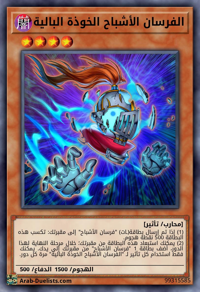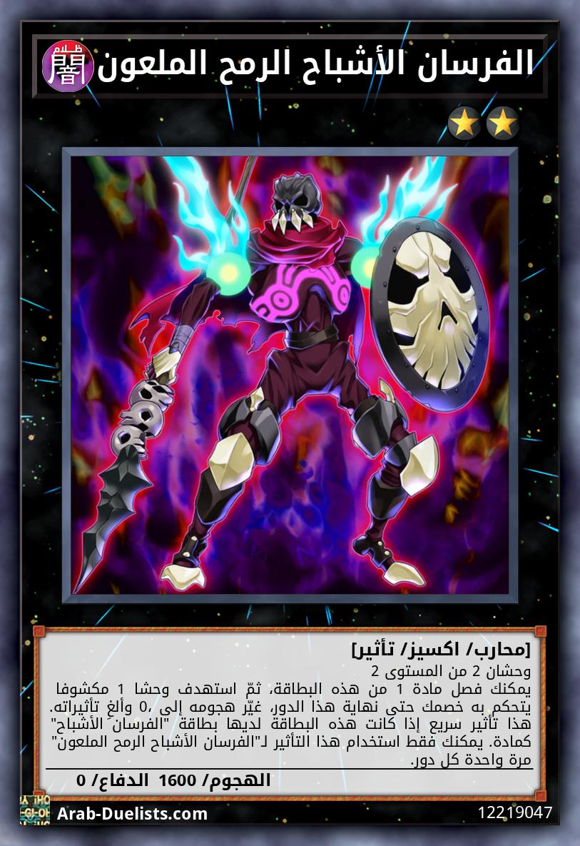 وحشان 2 من المستوى 2 يمكنك فصل مادة 1 من هذه البطاقة، ثمّ استهدف وحشا 1 مكشوفا يتحكم به خصمك حتى نهاية هذا الدور، غيّر هجومه إلى 0، وألغِ تأثيراته. هذا تأثير سريع إذا كانت هذه البطاقة لديها بطاقة "الفرسان الأشباح" كمادة. يمكنك فقط استخدام هذا التأثير لـ"الفرسان الأشباح الرمح الملعون" مرة واحدة كل دور.