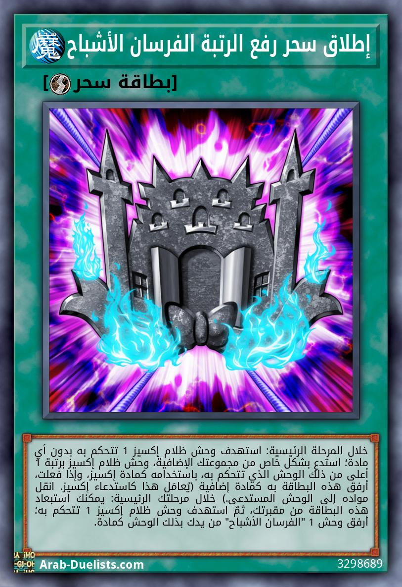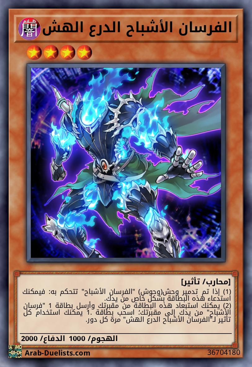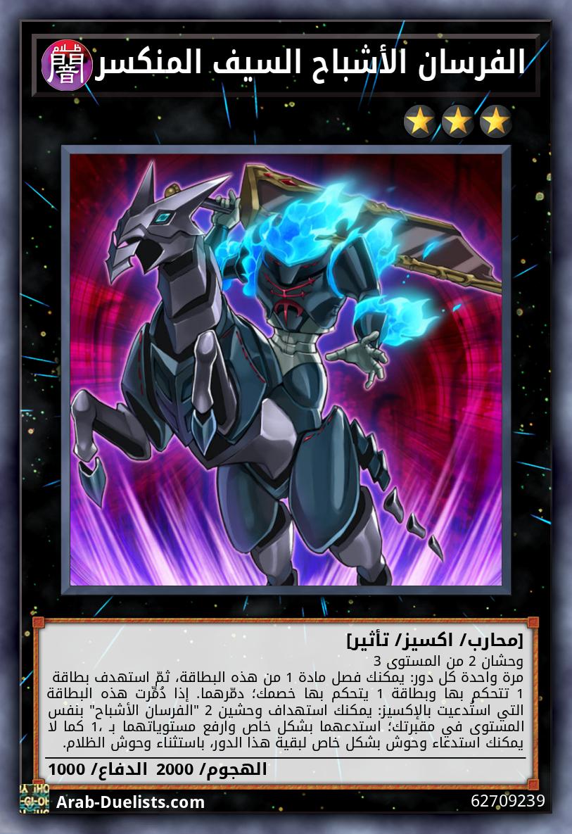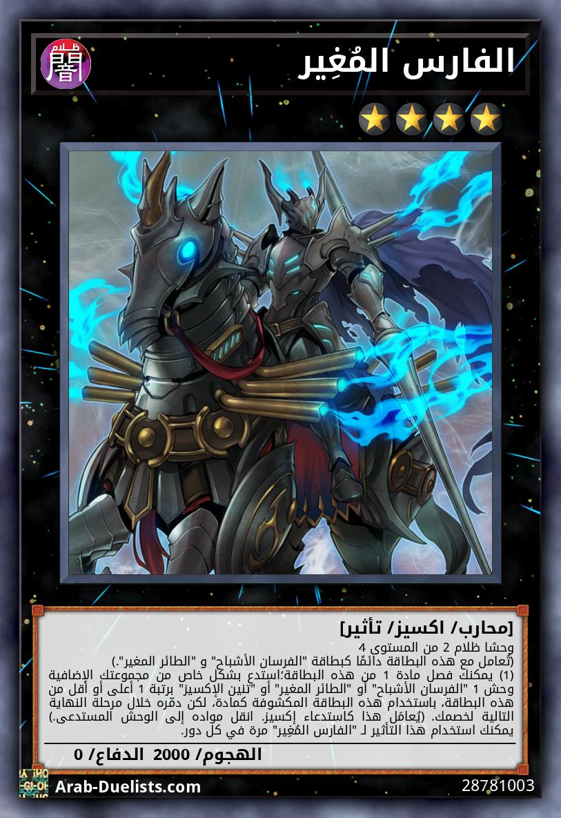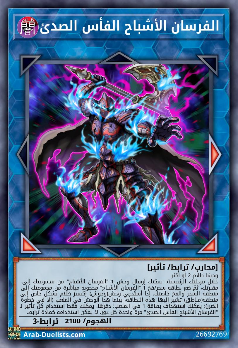 وحشا ظلام 2 من المستوى 4 (تُعامل مع هذه البطاقة دائمًا كبطاقة "الفرسان الأشباح" و "الطائر المغير".) (1) يمكنك فصل مادة 1 من هذه البطاقة؛استدع بشكل خاص من مجموعتك الإضافية وحش 1 "الفرسان الأشباح" أو "الطائر المغير" أو "تنين الإكسيز" برتبة 1 أعلى أو أقل من هذه البطاقة، باستخدام هذه البطاقة المكشوفة كمادة، لكن دمّره خلال مرحلة النهاية التالية لخصمك. (يُعامَل هذا كاستدعاء إكسيز. انقل مواده إلى الوحش المستدعى.) يمكنك استخدام هذا التأثير لـ "الفارس المُغِير" مرة في كل دور.