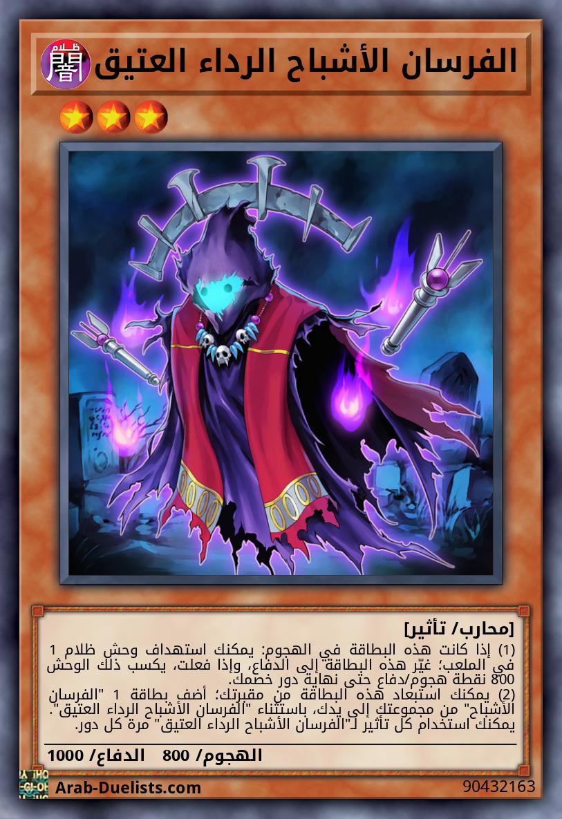 (1) إذا كانت هذه البطاقة في الهجوم: يمكنك استهداف وحش ظلام 1 في الملعب؛ غيّر هذه البطاقة إلى الدفاع، وإذا فعلت، يكسب ذلك الوحش 800 نقطة هجوم/دفاع حتى نهاية دور خصمك. (2) يمكنك استبعاد هذه البطاقة من مقبرتك؛ أضف بطاقة 1 "الفرسان الأشباح" من مجموعتك إلى يدك، باستثناء "الفرسان الأشباح الرداء العتيق". يمكنك استخدام كل تأثير لـ"الفرسان الأشباح الرداء العتيق" مرة كل دور.