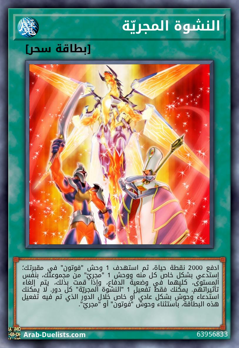 ادفع 2000 نقطة حياة، ثم استهدف 1 وحش "فوتون" في مقبرتك؛ إستدعي بشكل خاص كل منه ووحش 1 "مجريّ" من مجموعتك، بنفس المستوى، كليهما في وضعية الدفاع، وإذا قمت بذلك، يتم إلغاء تأثيراتهم. يمكنك فقط تفعيل 1 "النشوة المجريّة" كل دور. لا يمكنك استدعاء وحوش بشكل عادي أو خاص خلال الدور الذي تم فيه تفعيل هذه البطاقة، باستثناء وحوش "فوتون" أو "مجريّ".