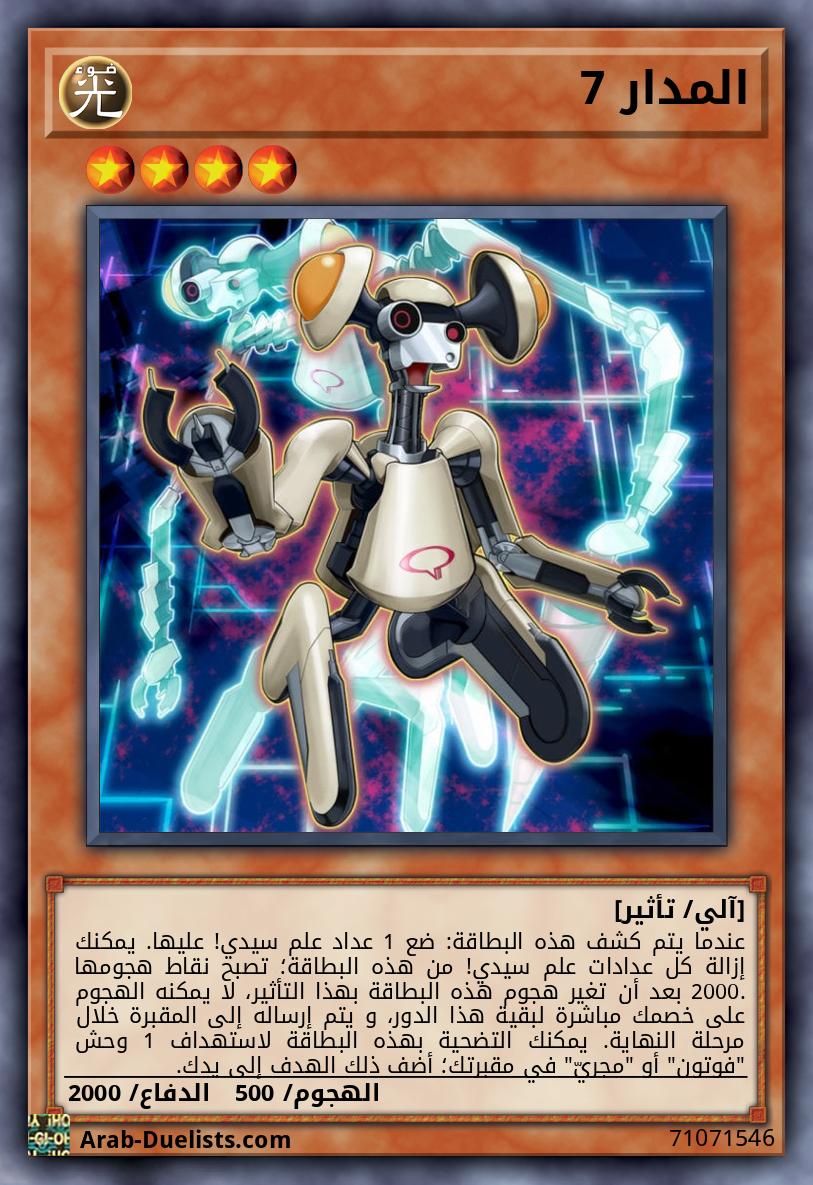 عند استدعاء هذه البطاقة بشكل عادي أو قُلِبَت لتصبح مكشوفة: يمكنك استهداف 1 "المدار 7" في مقبرتك؛ استدعِ ذلك الهدف بشكل خاص في وضعية الهجوم المكشوف أو في وضعية الدفاع المححوب. مرة كل دور، يمكنك التضحية بأي عدد من الوحوش من نوع آلي؛ استدعِ بشكل خاص عدداً مساويا من وحوش "فوتون" و/أو "مجريّ" من يدك.