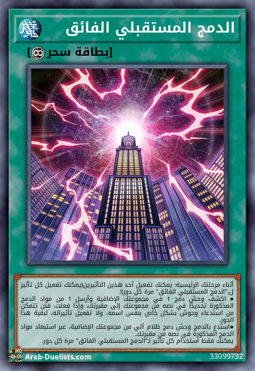 أثناء مرحلتك الرئيسية: يمكنك تفعيل أحد هذين التأثيرين(يمكنك تفعيل كل تأثير ل،"الدمج المستقبلي الفائق" مرة كل دور)؛ ● اكشف وحش دمج 1 في مجموعتك الإضافية وأرسل 1 من مواد الدمج المذكورة تحديدًا في نصه من مجموعتك إلى مقبرتك، وإذا فعلت، فلن تتمكن من استدعاء وحوش بشكل خاص بنفس اسمه، ولا تفعيل تأثيراته، لبقية هذا الدور. ●استدع بالدمج وحش دمج ظلام آلي من مجموعتك الإضافية، عبر استبعاد مواد الدمج المذكورة في نصه من مقبرتك. يمكنك فقط استخدام كل تأثير لـ"الدمج المستقبلي الفائق" مرة كل دور.