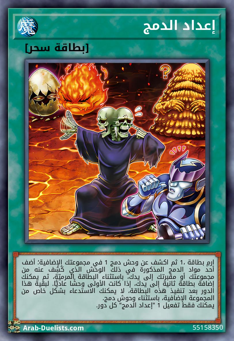 ارمِ بطاقة 1، ثم اكشف عن وحش دمج 1 في مجموعتك الإضافية؛ أضف أحد مواد الدمج المذكورة في ذلك الوحش الذي كُشِف عنه من مجموعتك أو مقبرتك إلى يدك، باستثناء البطاقة المرميّة، ثم يمكنك إضافة بطاقة ثانية إلى يدك، إذا كانت الأولى وحشًا عاديًّا. لبقية هذا الدور بعد تنفيذ هذه البطاقة، لا يمكنك الاستدعاء بشكل خاص من المجموعة الإضافية، باستثناء وحوش دمج. يمكنك فقط تفعيل 1 "إعداد الدمج" كل دور.