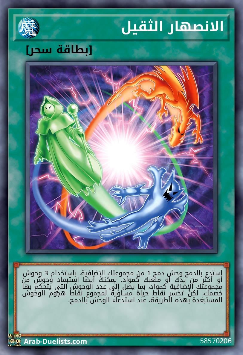 لا يمكن لأي لاعب تفعيل البطاقات أو التأثيرات ردًا على تفعيل هذه البطاقة. ادفع 2000 نقطة حياة، ثم استهدف وحش تأثير 1 في الملعب؛ استدعِ وحشًا 1 بشكل خاص من مجموعتك الإضافية بنفس النوع والعنصر، ولكن بمستوى مختلف (تُلغى تأثيراته)، ثم طبق أحد هذين التأثيرين: ● استدع بالدمج وحش دمج 1 من مجموعتك الإضافية، باستخدام كلا من الوحش المستدعى والوحش المستهدف. ● أرسل الوحش المستدعى إلى المقبرة. يمكنك فقط تفعيل 1 "الانصهار الأقصى" مرة كل دور.