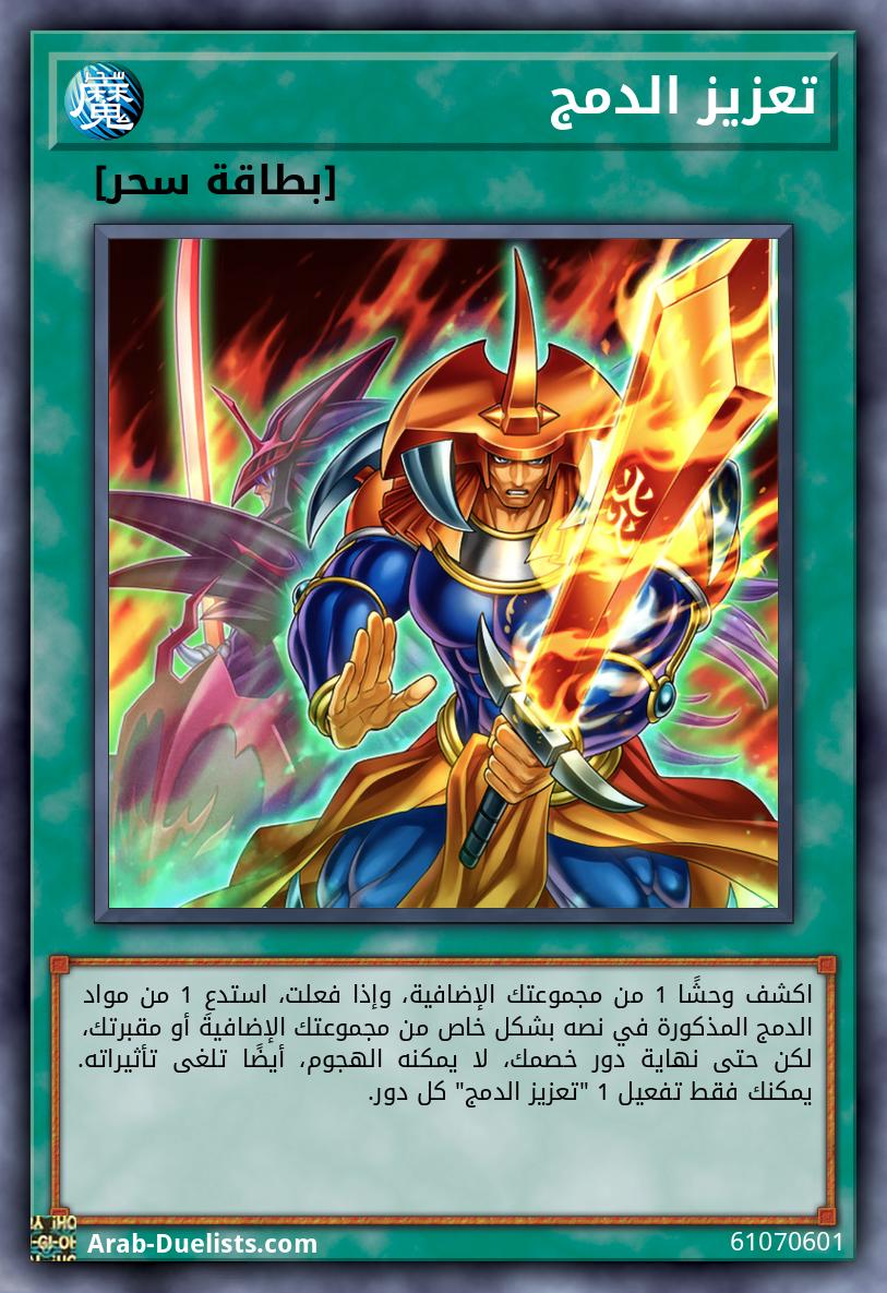 اكشف وحشًا 1 من مجموعتك الإضافية، وإذا فعلت، استدعِ 1 من مواد الدمج المذكورة في نصه بشكل خاص من مجموعتك الإضافية أو مقبرتك، لكن حتى نهاية دور خصمك، لا يمكنه الهجوم، أيضًا تلغى تأثيراته. يمكنك فقط تفعيل 1 "تعزيز الدمج" كل دور.
