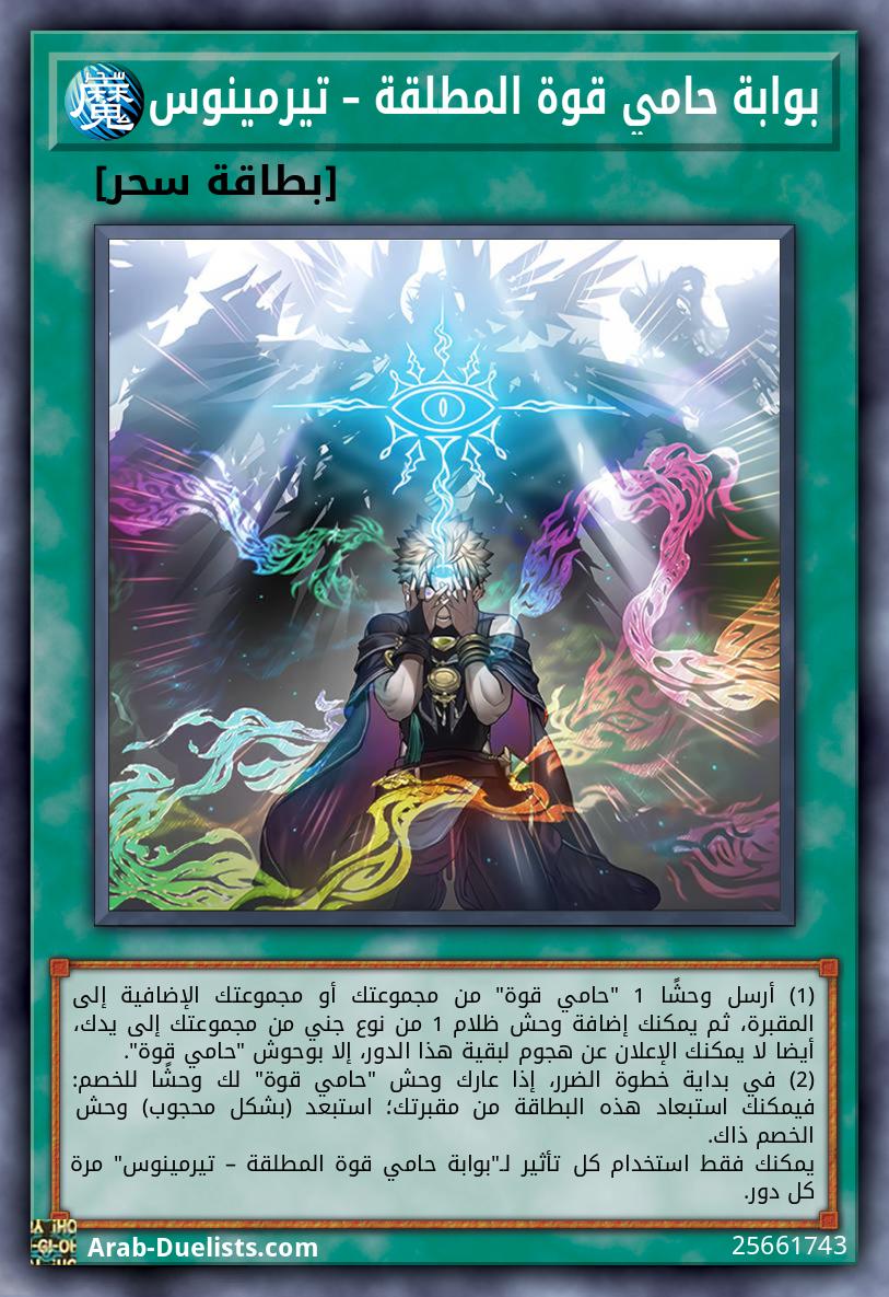 (1) أرسل وحشًا 1 "حامي قوة" من مجموعتك أو مجموعتك الإضافية إلى المقبرة، ثم يمكنك إضافة وحش ظلام 1 من نوع جني من مجموعتك إلى يدك، أيضا لا يمكنك الإعلان عن هجوم لبقية هذا الدور، إلا بوحوش "حامي قوة". (2) في بداية خطوة الضرر، إذا عارك وحش "حامي قوة" لك وحشًا للخصم: فيمكنك استبعاد هذه البطاقة من مقبرتك؛ استبعد (بشكل محجوب) وحش الخصم ذاك. يمكنك فقط استخدام كل تأثير لـ"بوابة حامي قوة المطلقة – تيرمينوس" مرة كل دور.