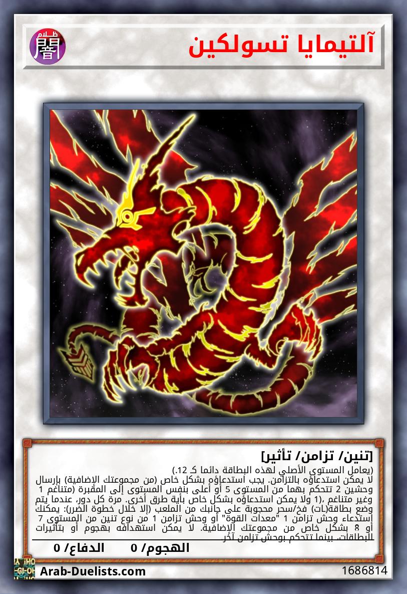 (يعامل المستوى الأصلي لهذه البطاقة دائما كـ 12.) لا يمكن استدعاؤه بالتزامن. يجب استدعاؤه بشكل خاص (من مجموعتك الإضافية) بإرسال وحشين 2 تتحكم بهما من المستوى 5 أو أعلى بنفس المستوى إلى المقبرة (متناغم 1 وغير متناغم 1)، ولا يمكن استدعاؤه بشكل خاص بأية طرق أخرى. مرة كل دور، عندما يتم وضع بطاقة(ـات) فخ/سحر محجوبة على جانبك من الملعب (إلا خلال خطوة الضرر): يمكنك استدعاء وحش تزامن 1 "معدات القوة" أو وحش تزامن 1 من نوع تنين من المستوى 7 أو 8 بشكل خاص من مجموعتك الإضافية. لا يمكن استهدافه بهجوم أو بتأثيرات البطاقات، بينما تتحكم بوحش تزامن آخر.