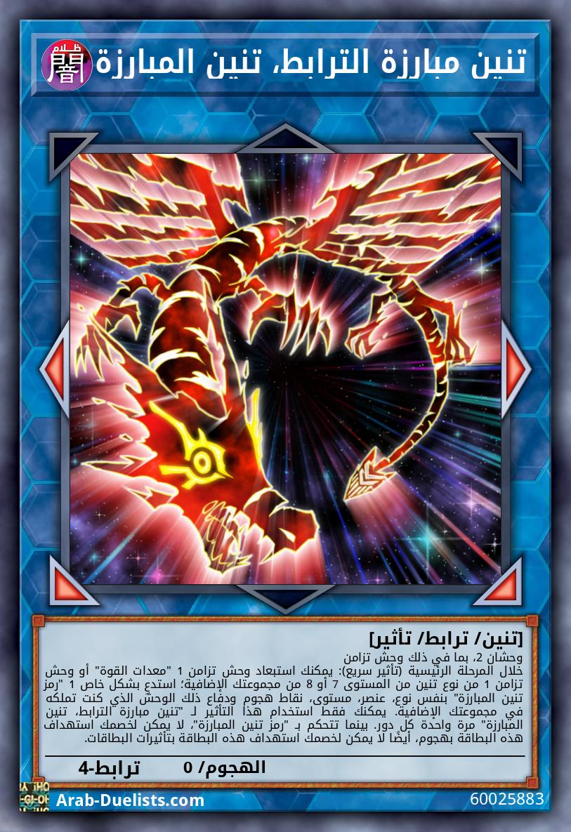 وحشان 2، بما في ذلك وحش تزامن خلال المرحلة الرئيسية (تأثير سريع): يمكنك استبعاد وحش تزامن 1 "معدات القوة" أو وحش تزامن 1 من نوع تنين من المستوى 7 أو 8 من مجموعتك الإضافية؛ استدعِ بشكل خاص 1 "رمز تنين المبارزة" بنفس نوع، عنصر، مستوى، نقاط هجوم ودفاع ذلك الوحش الذي كنت تملكه في مجموعتك الإضافية. يمكنك فقط استخدام هذا التأثير لـ "تنين مبارزة الترابط، تنين المبارزة" مرة واحدة كل دور. بينما تتحكم بـ "رمز تنين المبارزة"، لا يمكن لخصمك استهداف هذه البطاقة بهجوم، أيضًا لا يمكن لخصمك استهداف هذه البطاقة بتأثيرات البطاقات.