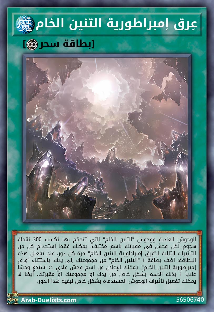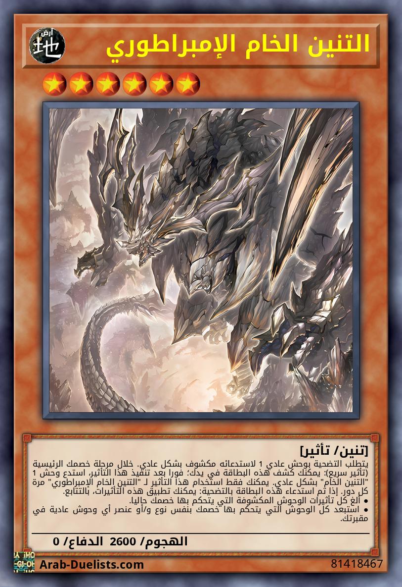 يتطلب التضحية بوحش عادي 1 لاستدعائه مكشوف بشكل عادي. خلال مرحلة خصمك الرئيسية (تأثير سريع): يمكنك كشف هذه البطاقة في يدك؛ فورا بعد تنفيذ هذا التأثير، استدع وحش 1 "التنين الخام" بشكل عادي. يمكنك فقط استخدام هذا التأثير لـ "التنين الخام الإمبراطوري" مرة كل دور. إذا تم استدعاء هذه البطاقة بالتضحية: يمكنك تطبيق هذه التأثيرات، بالتتابع. ● ألغ كل تأثيرات الوحوش المكشوفة التي يتحكم بها خصمك حاليا. ● استبعد كل الوحوش التي يتحكم بها خصمك بنفس نوع و/أو عنصر أي وحوش عادية في مقبرتك.