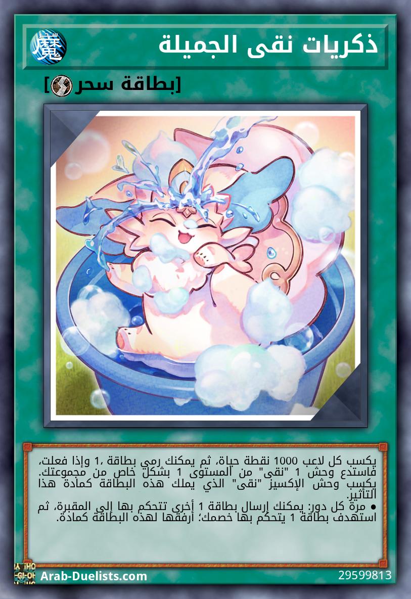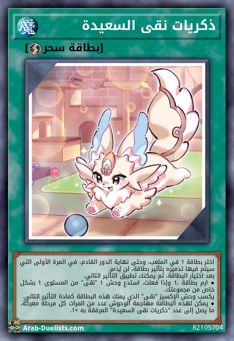 وحشان 2 من المستوى 2 مرة كل دور: يمكنك استهداف وحش تأثير 1 يتحكم به خصمك؛ ألغ تأثيراته حتى نهاية هذا الدور. هذا التأثير سريع إذا كانت هذه البطاقة تملك "ذكريات نقى الجميلة" كمادة. ثلاث مرات كل دور، عندما تفعل سحر لعب سريع "نقى" (تأثير سريع): يمكنك إرفاق تلك البطاقة في الملعب إلى هذه البطاقة كمادة، ثم يمكنك تغيير وضعية معركة 1 من الوحوش التي يتحكم بها خصمك.