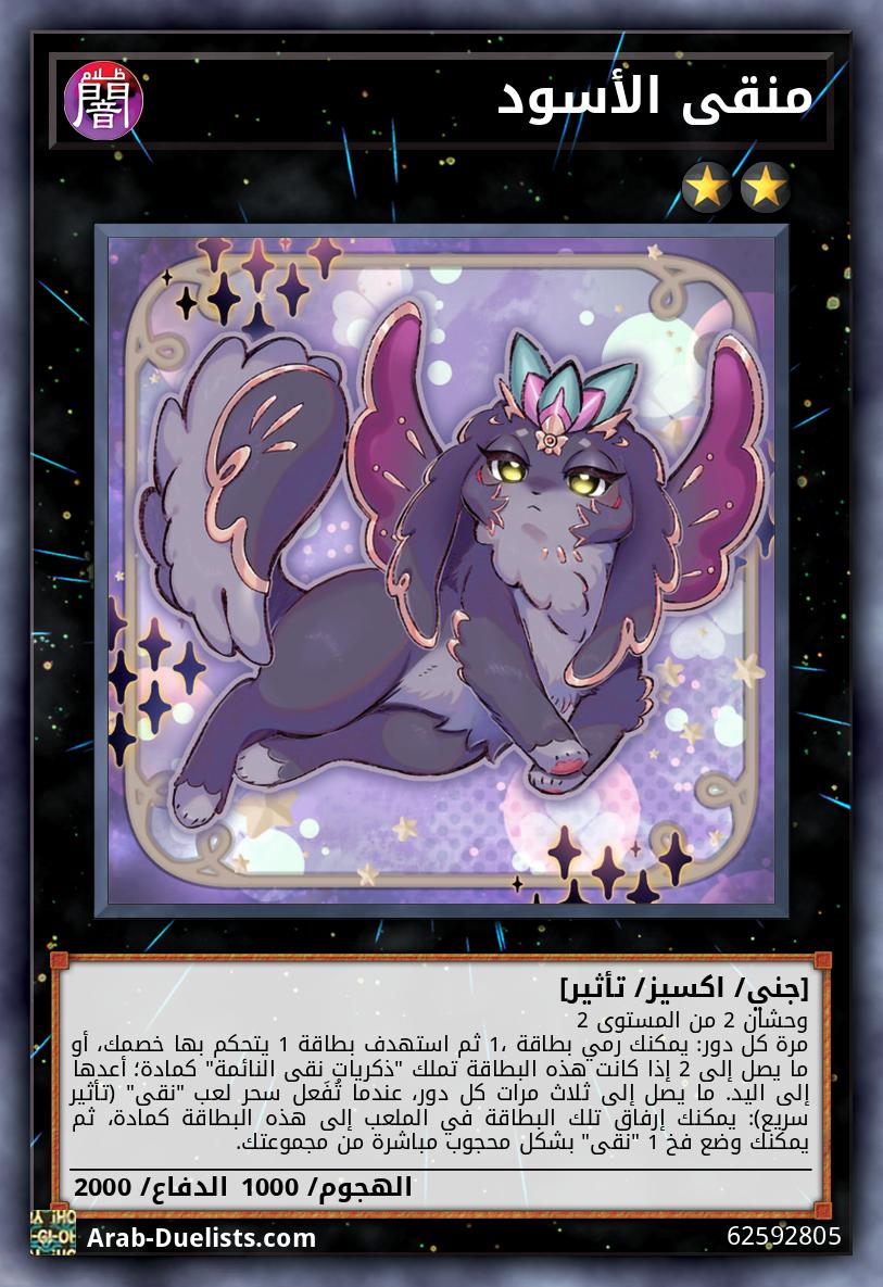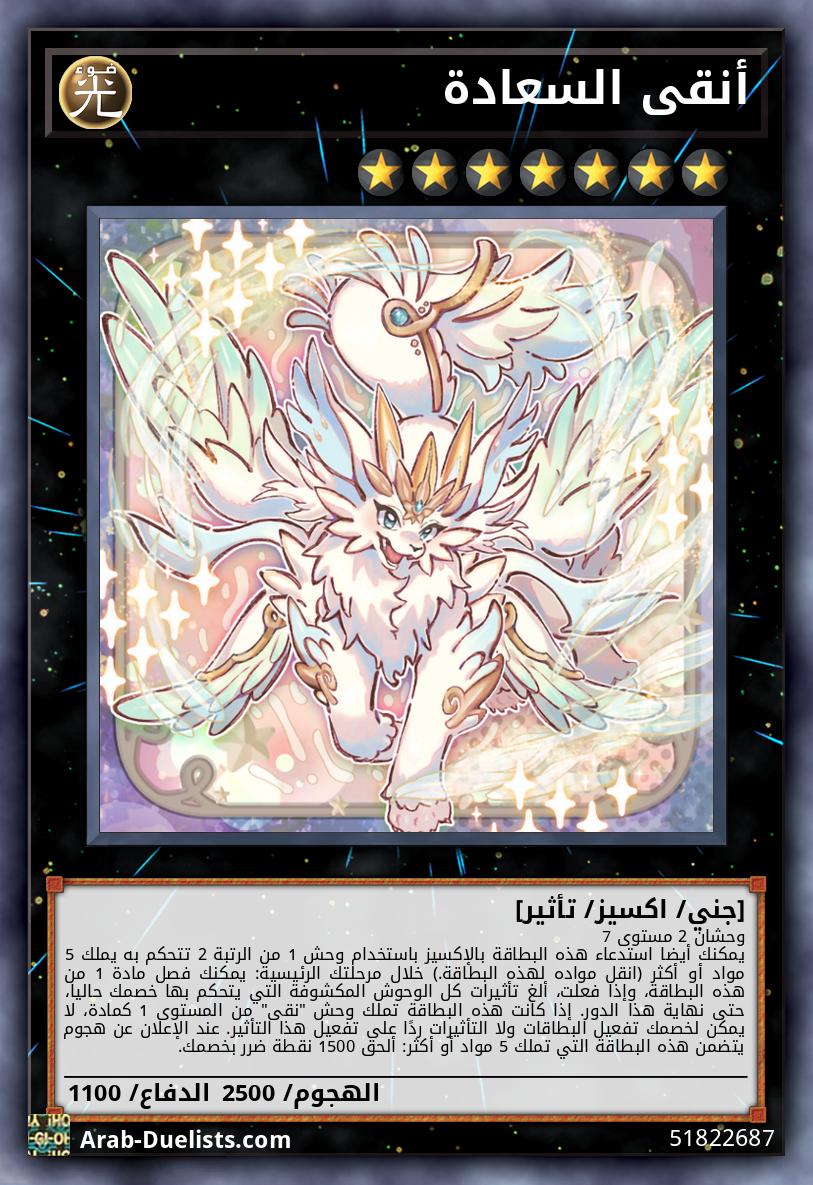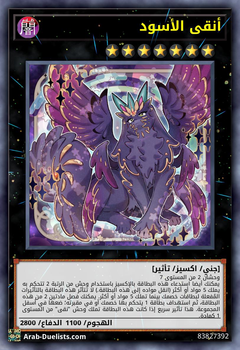وحشان 2 مستوى 7 يمكنك أيضا استدعاء هذه البطاقة بالإكسيز باستخدام وحش 1 من الرتبة 2 تتحكم به يملك 5 مواد أو أكثر (انقل مواده لهذه البطاقة.) خلال مرحلتك الرئيسية: يمكنك فصل مادة 1 من هذه البطاقة، وإذا فعلت، ألغ تأثيرات كل الوحوش المكشوفة التي يتحكم بها خصمك حاليا، حتى نهاية هذا الدور. إذا كانت هذه البطاقة تملك وحش "نقى" من المستوى 1 كمادة، لا يمكن لخصمك تفعيل البطاقات ولا التأثيرات ردًا على تفعيل هذا التأثير. عند الإعلان عن هجوم يتضمن هذه البطاقة التي تملك 5 مواد أو أكثر: ألحق 1500 نقطة ضرر بخصمك.