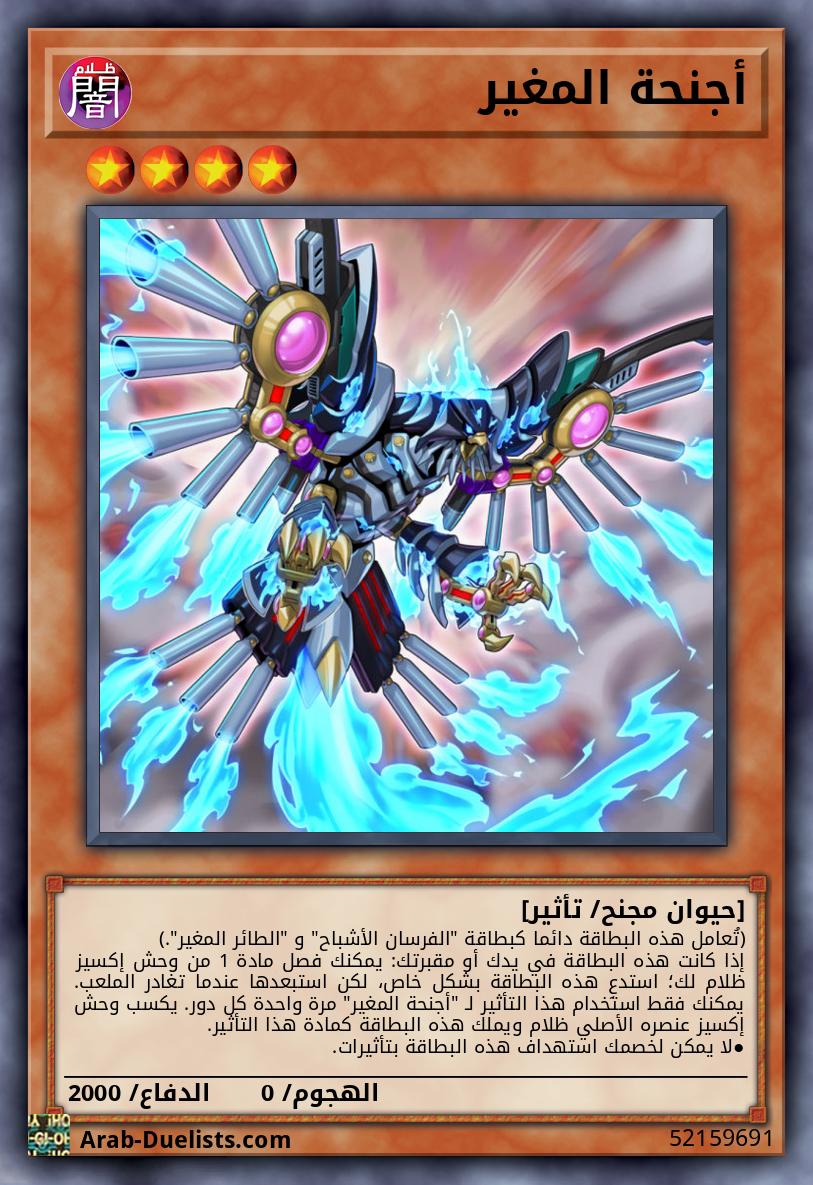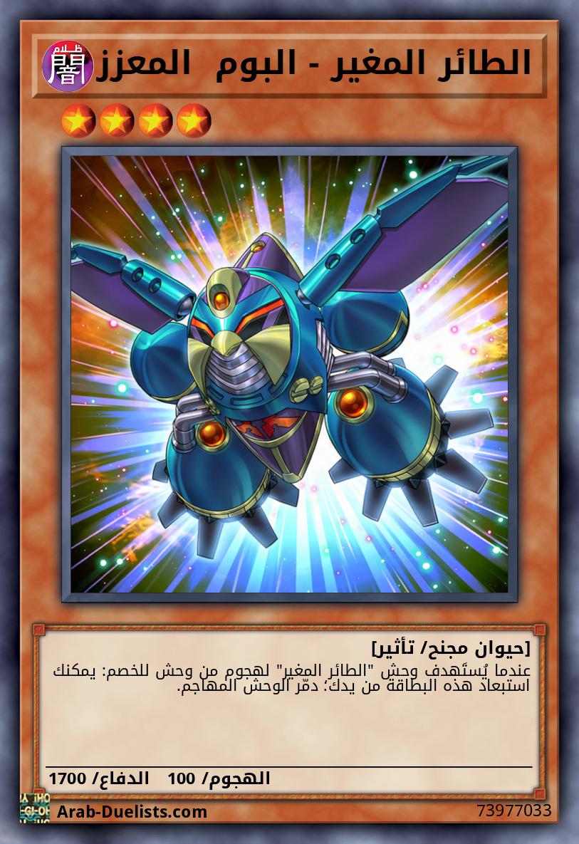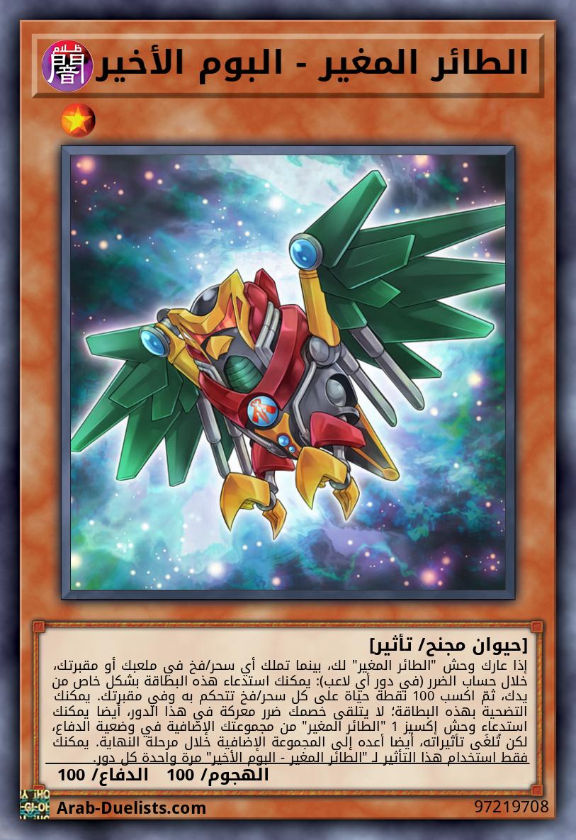 وحشان 2 من المستوى 5 وحش الإكسيز "الطائر المغير" الذي يملك هذه البطاقة كمادة يكسب هذا التأثير. ● يكسب نقاط هجوم مساوية لرتبته × 100. يمكنك فقط استخدام 1 من التأثيرات التالية لـ"البوم الشجاع - الطائر المغير" كل دور، ومرة فقط في ذلك الدور. يمكنك فصل مادة 1 من هذه البطاقة؛ ضع سحر/فخ 1 "الطائر المغير" مباشرة من مجموعتك بشكل محجوب. إذا كانت هذه البطاقة تملك وحش من نوع حيوان مجنح كمادة: فيمكنك فصل مادة 1 من هذه البطاقة؛ أضف سحر 1 "سحر رفع الرتبة" من مجموعتك إلى يدك.