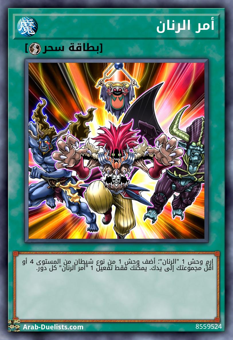 ارمِ وحش 1 "الرنان"؛ أضف وحش 1 من نوع شيطان من المستوى 4 أو أقل مجموعتك إلى يدك. يمكنك فقط تفعيل 1 "أمر الرنان" كل دور.