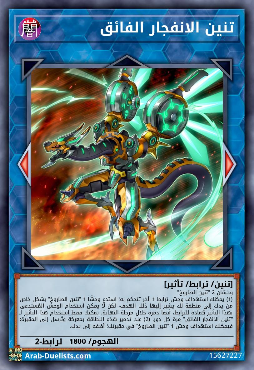 وحشان 2 "تنين الصاروخ" (1) يمكنك استهداف وحش ترابط 1 آخر تتحكم به؛ استدعِ وحشًا 1 "تنين الصاروخ" بشكل خاص من يدك إلى منطقة لك يشير إليها ذلك الهدف، لكن لا يمكن استخدام الوحش المُستدعى بهذا التأثير كمادة للترابط، أيضا دمره خلال مرحلة النهاية. يمكنك فقط استخدام هذا التأثير لـ "تنين الانفجار الفائق" مرة كل دور. (2) عند تدمير هذه البطاقة بمعركة وتُرسل إلى المقبرة: فيمكنك استهداف وحش 1 "تنين الصاروخ" في مقبرتك؛ أضفه إلى يدك.