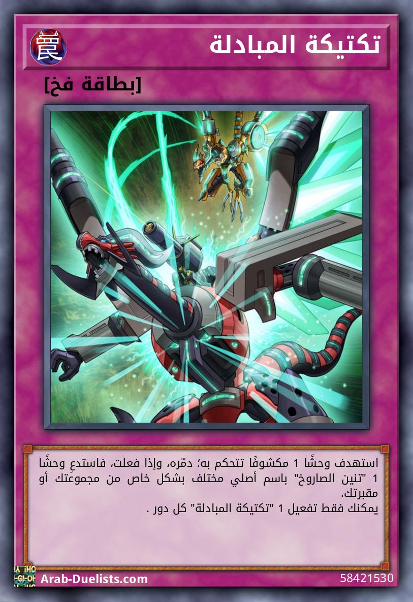 استهدف وحشًا 1 مكشوفًا تتحكم به؛ دمّره، وإذا فعلت، فاستدعِ وحشًا 1 "تنين الصاروخ" باسم أصلي مختلف بشكل خاص من مجموعتك أو مقبرتك. يمكنك فقط تفعيل 1 "تكتيكة المبادلة" كل دور .