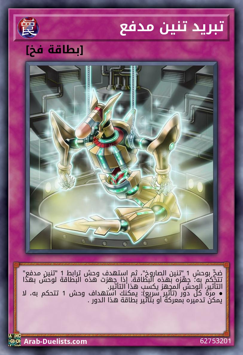 ضحِّ بوحش 1 "تنين الصاروخ"، ثم استهدف وحش ترابط 1 "تنين مدفع" تتحكم به؛ جهّزه بهذه البطاقة. إذا جهزت هذه البطاقة لوحش بهذا التأثير، الوحش المجهز يكسب هذا التأثير. ● مرة كل دور (تأثير سريع): يمكنك استهداف وحش 1 تتحكم به، لا يمكن تدميره بمعركة أو بتأثير بطاقة هذا الدور .