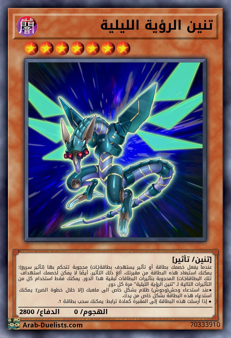 عندما يفعل خصمك بطاقة أو تأثير يستهدف بطاقة(ـات) محجوبة تتحكم بها (تأثير سريع): يمكنك استبعاد هذه البطاقة من مقبرتك، ألغِ ذلك التأثير، أيضًا لا يمكن لخصمك استهداف تلك البطاقة(ـات) المحجوبة بتأثيرات البطاقات لبقية هذا الدور. يمكنك فقط استخدام كل من التأثيرات التالية لـ "تنين الرؤية الليلية" مرة كل دور. ●عند استدعاء وحش(وحوش) ظلام بشكل خاص الى ملعبك (إلا خلال خطوة الضرر): يمكنك استدعاء هذه البطاقة بشكل خاص من يدك. ● إذا أُرسلت هذه البطاقة إلى المقبرة كمادة ترابط: يمكنك سحب بطاقة 1.
