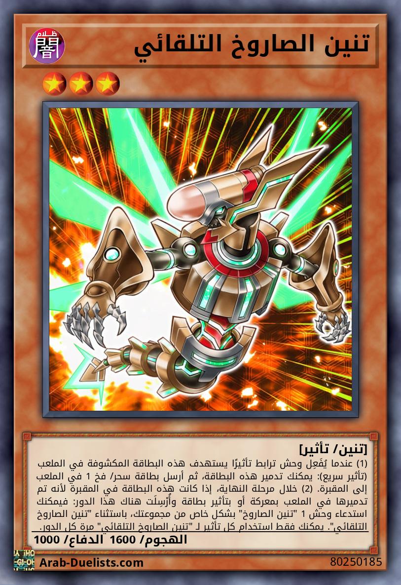 (1) عندما يُفَعِل وحش ترابط تأثيرًا يستهدف هذه البطاقة المكشوفة في الملعب (تأثیر سریع): يمكنك تدمير هذه البطاقة، ثم أرسل بطاقة سحر/ فخ 1 في الملعب إلى المقبرة. (2) خلال مرحلة النهاية، إذا كانت هذه البطاقة في المقبرة لأنه تم تدميرها في الملعب بمعركة أو بتأثیر بطاقة وأُرْسِلَت هناك هذا الدور: فيمكنك استدعاء وحش 1 "تنين الصاروخ" بشكل خاص من مجموعتك، باستثناء "تنين الصاروخ التلقائي". يمكنك فقط استخدام كل تأثير لـ "تنين الصاروخ التلقائي" مرة كل الدور.