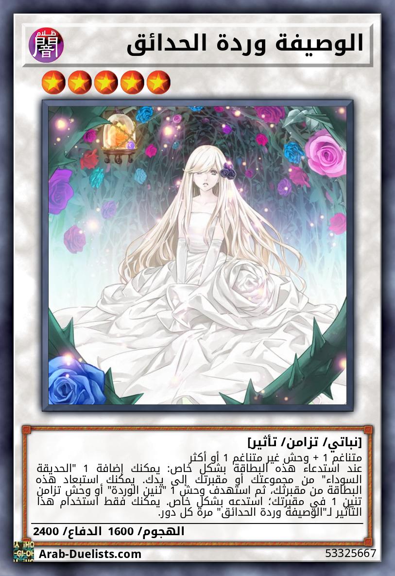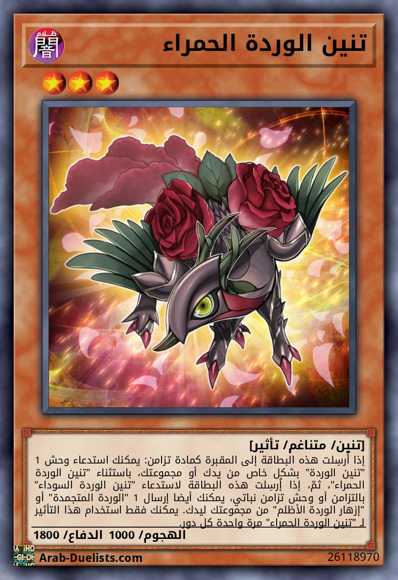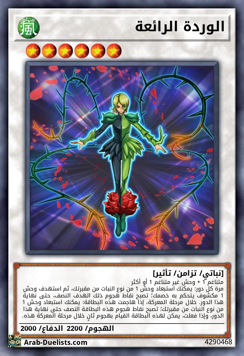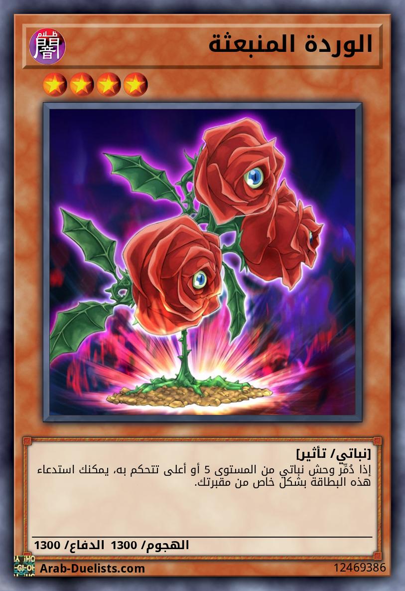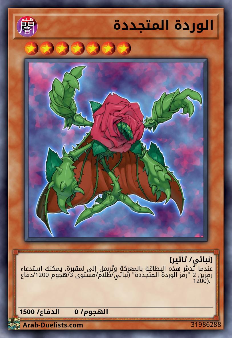 عندما تُدمَّر هذه البطاقة بالمعركة وتُرسَل إلى لمقبرة، يمكنك استدعاء رمزين 2 "رمز الوردة المتجددة" (نباتي/ظلام/مستوى 3/هجوم 1200/دفاع 1200).